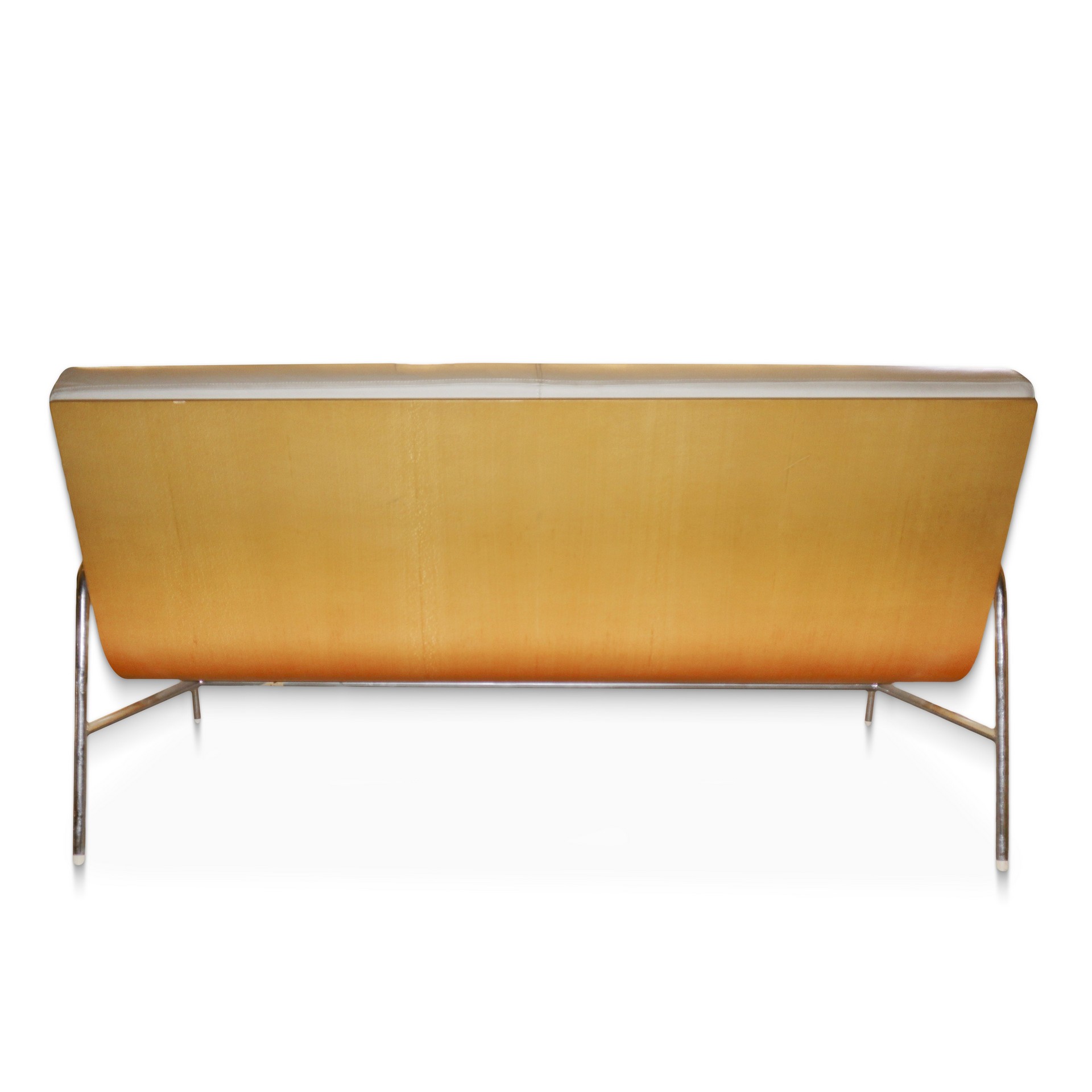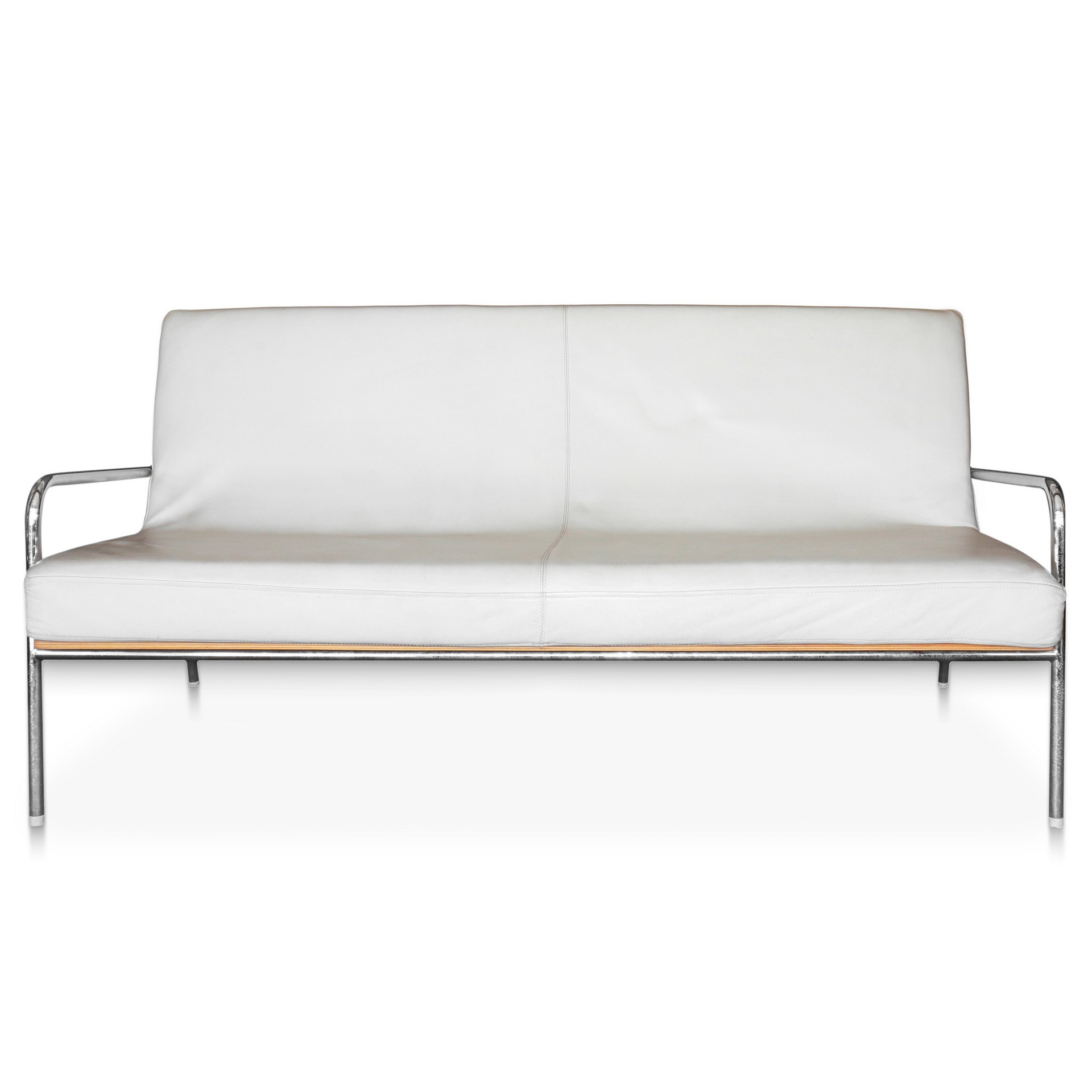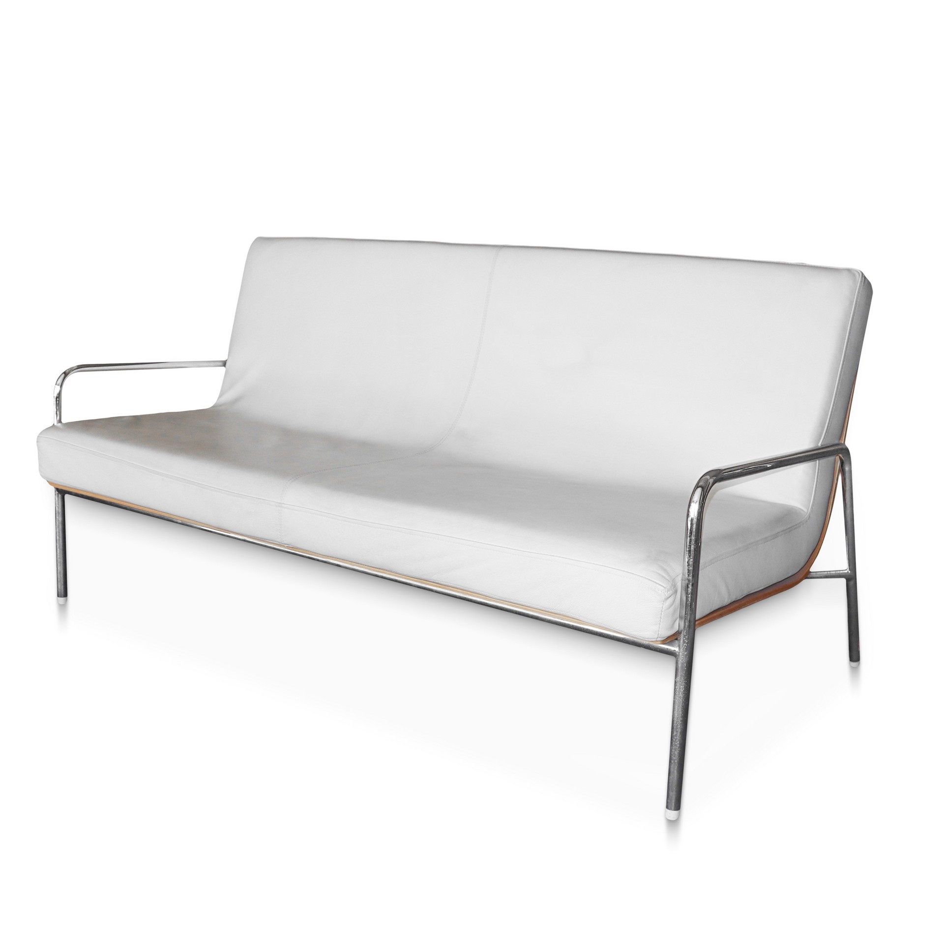 Divano prod. Italiana Alivar con struttura cromata e tappezzeria in pelle bianca e schienale di sost