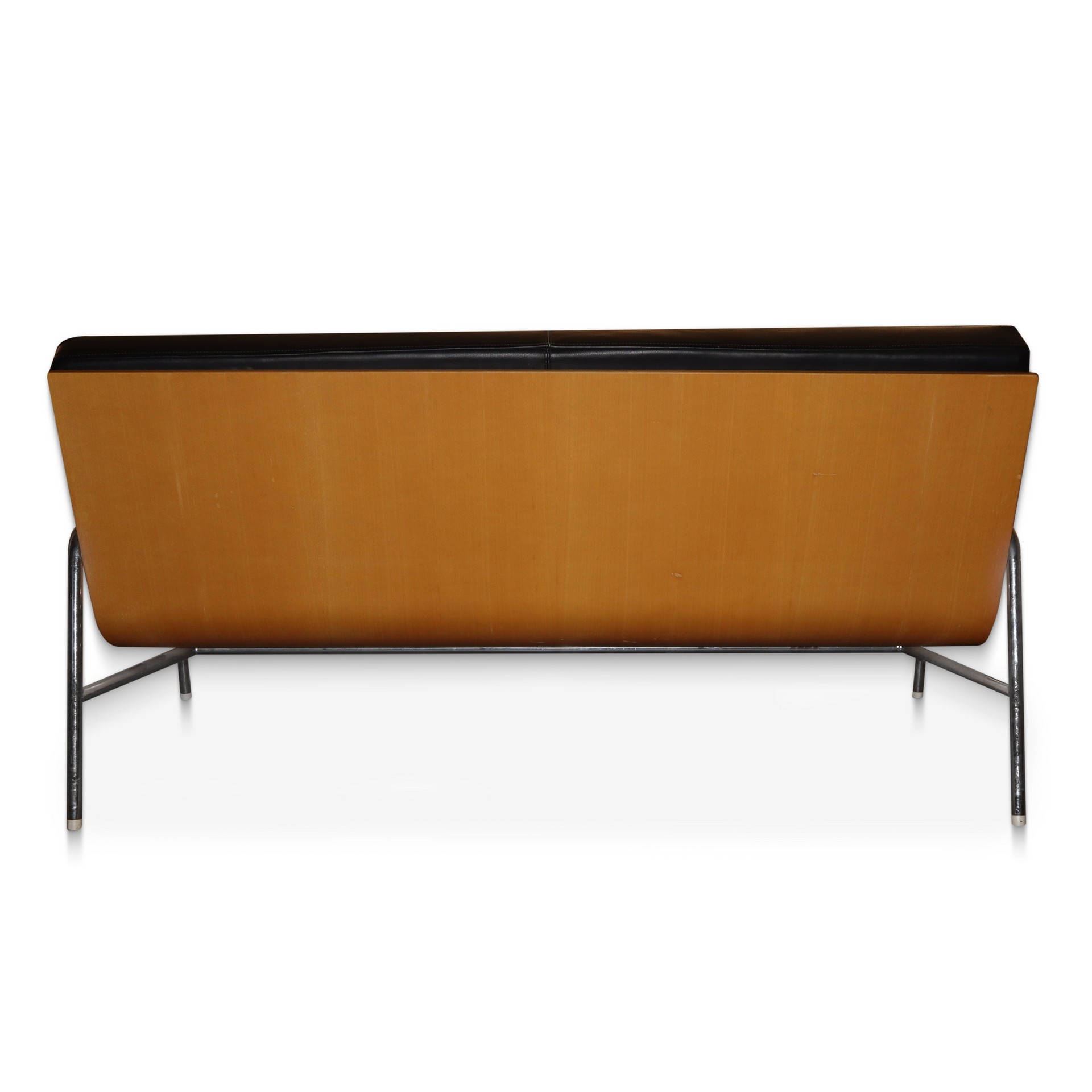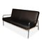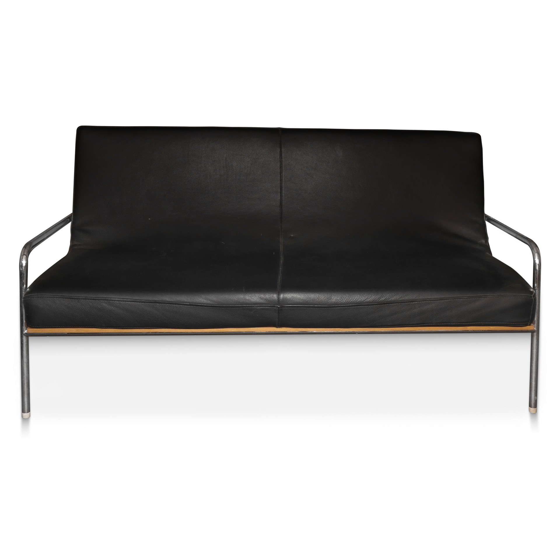 Divano prod. Italia Alivar con struttura cromata e tappezzeria in pelle nera e schienale di sostegno
