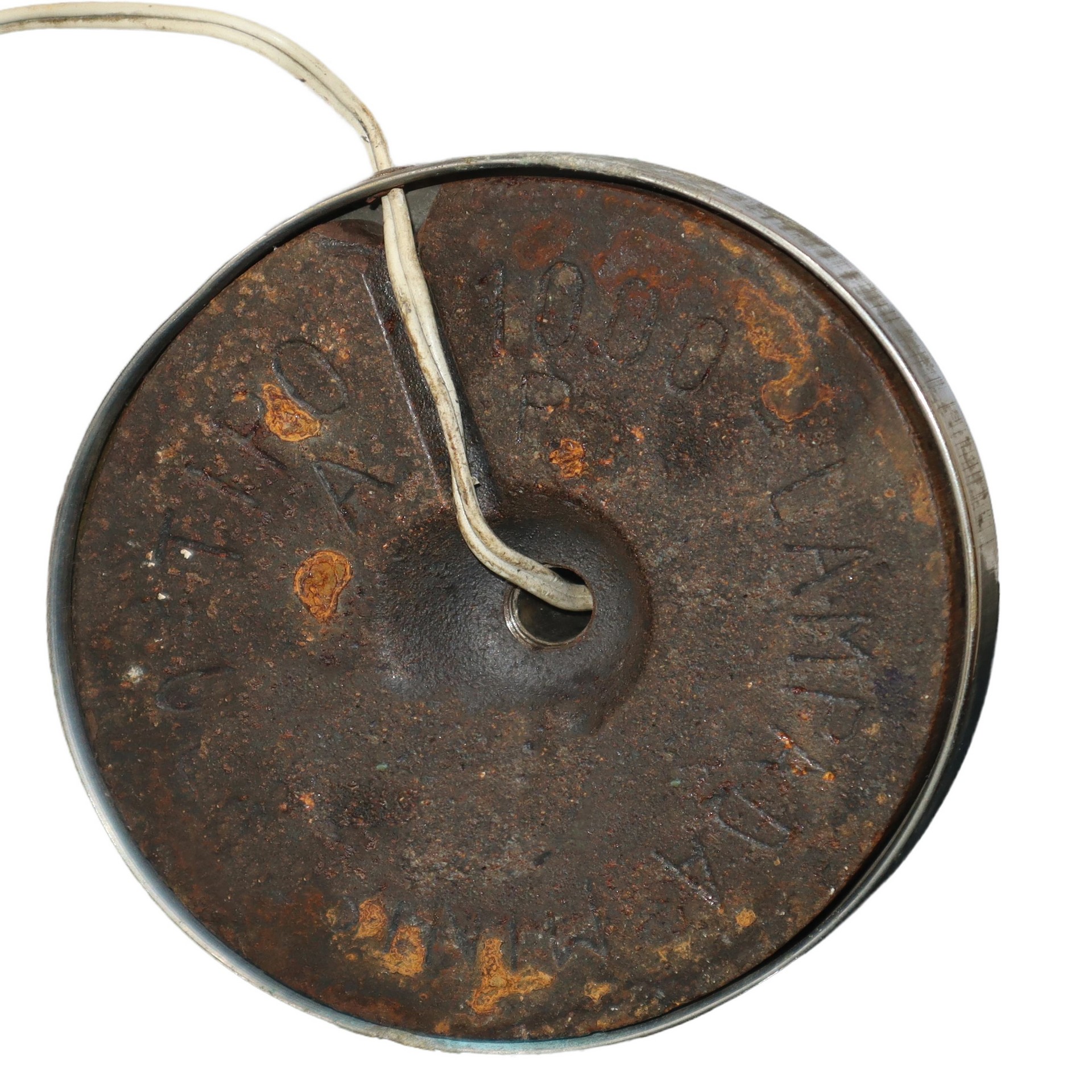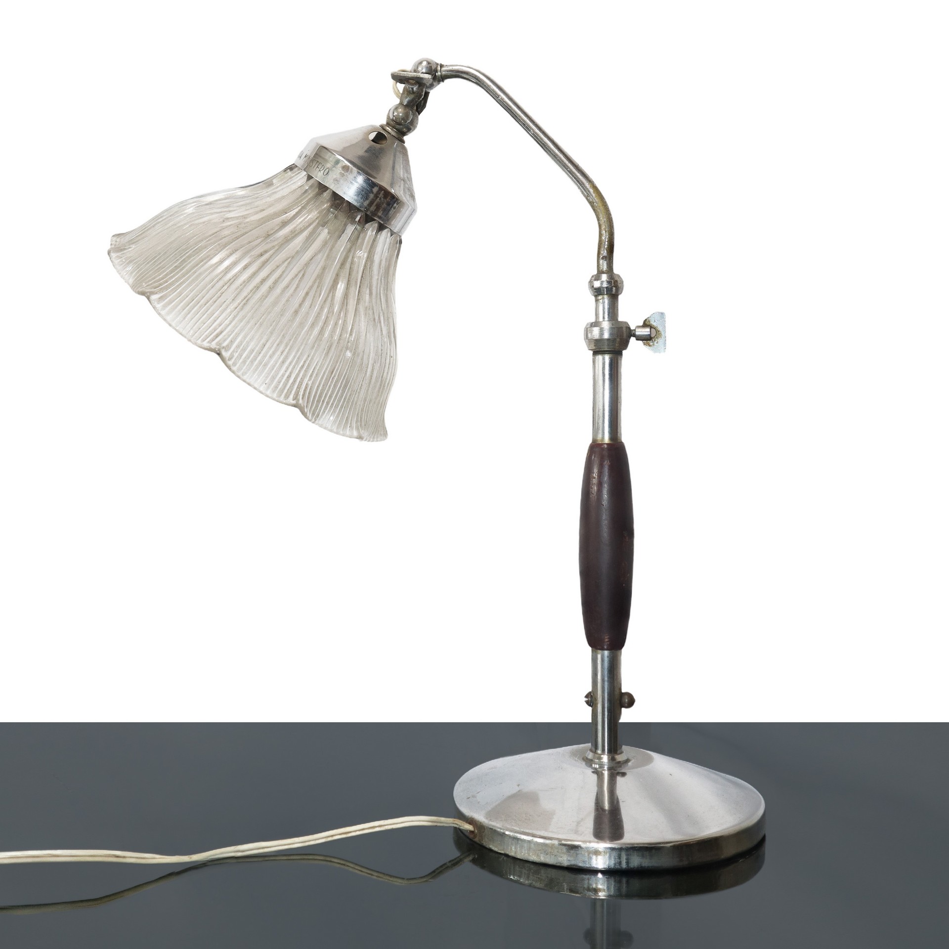Lume da tavolo in legno e acciaio con doppio snodo a farfalla., 40s H cm 36x28 Con scritta Lampada
