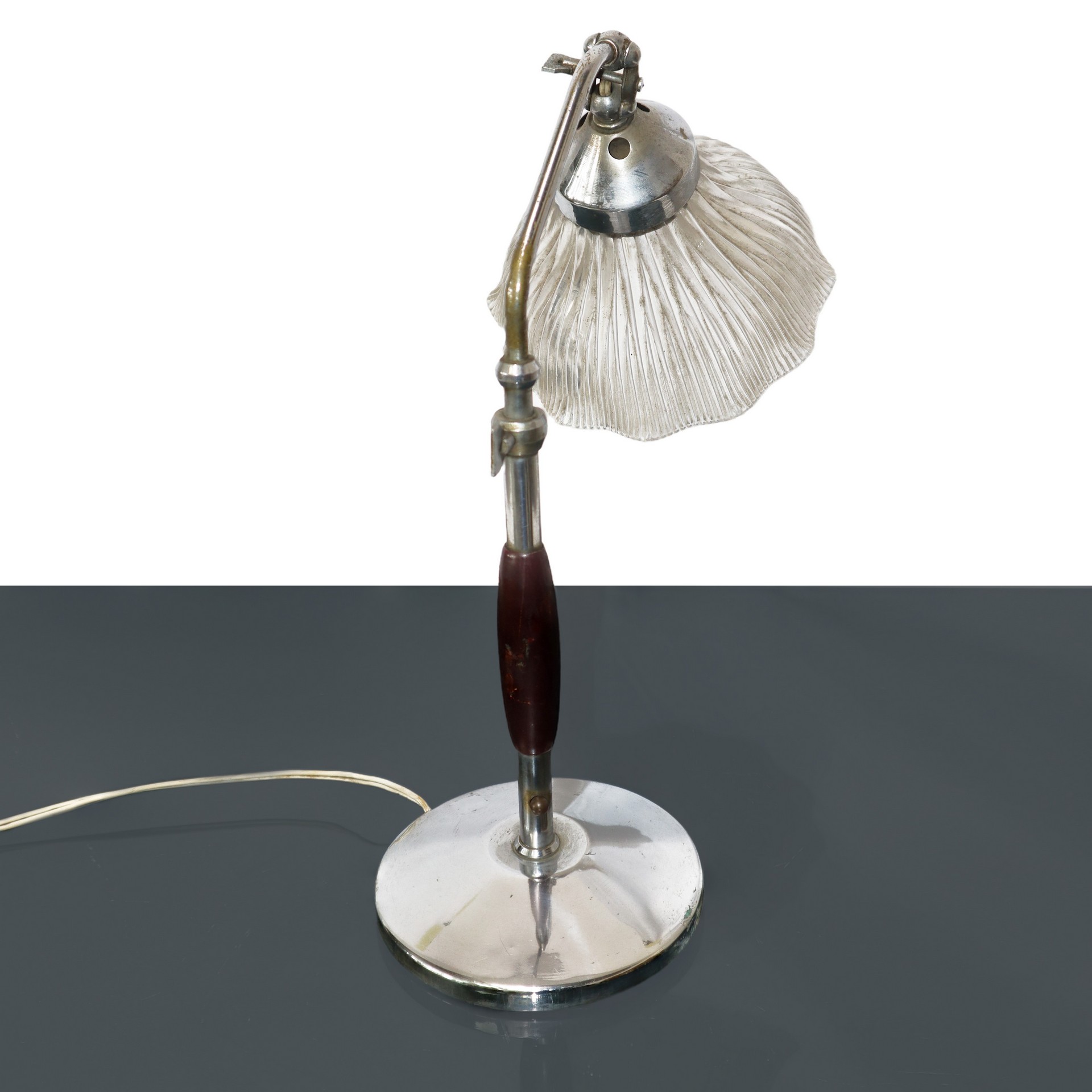 Lume da tavolo in legno e acciaio con doppio snodo a farfalla., 40s