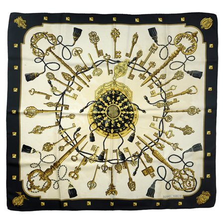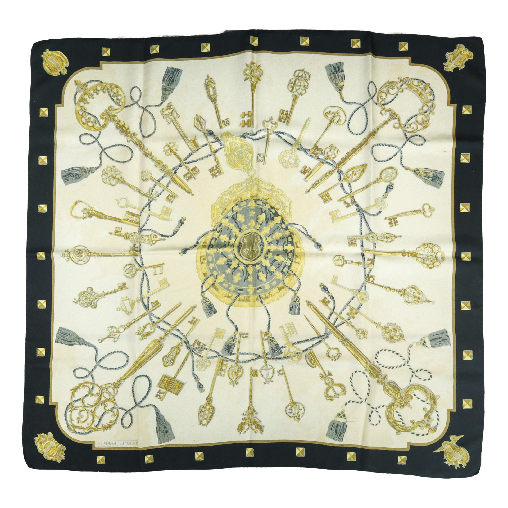 Caty Latham per Hermès - Foulard in twill di seta modello Les Clefs, 1980 cm 90x90 A base panna e c