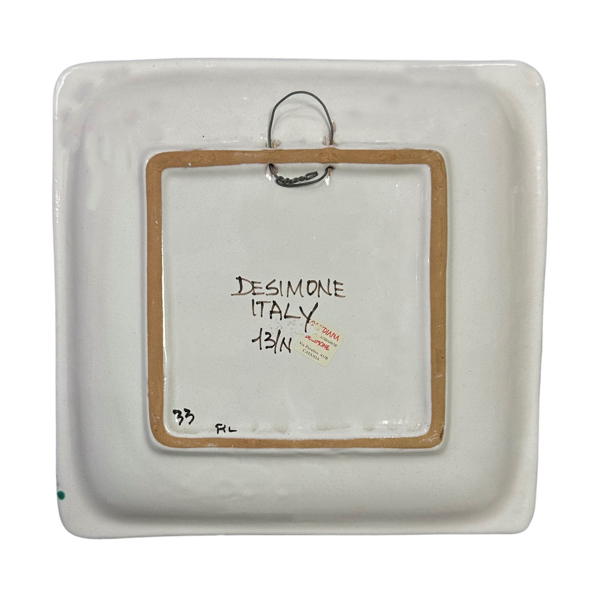 De Simone - Piatto quadrato in ceramica policroma con mestieri, 1960/70 H cm 25x25 Spugnato verde a