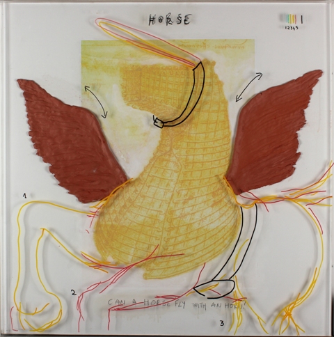 EMILIO LEOFREDDI Roma 1958 Horse, 2007 Tecnica mista di acrilici, gesso, pennarelli e collage su tela con teca il plexiglass trasparente anch'essa disegnata , cm. 95 x 95 Titolo in alto al centro Firma, data e titolo al retro