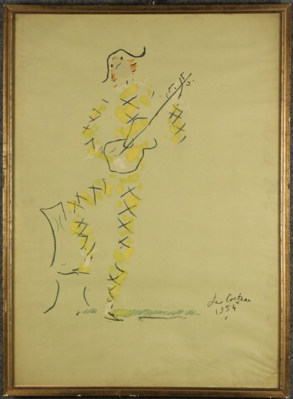 COCTEAU JEAN - Nato a Maisons-Laffitte (Francia) nel 1889. Morto a Milly-la-Foret (Francia) nel 1963. Disegno a pastello su carta raff. ''ARLECCHINO SUONATORE''. Firmato e datato 1954 in basso a destra. In cornice. Mis. Lung. cm. 47 Alt. cm. 65 ca.