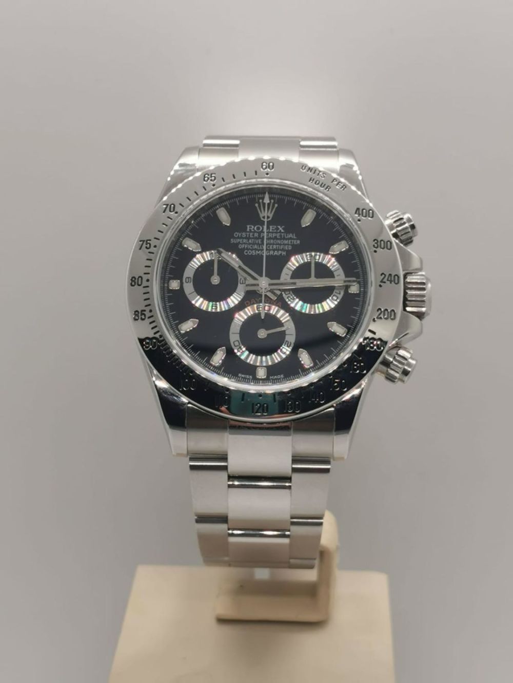 Marca Rolex Modello (Orologio) Daytona Numero di referenza 116520 Carica Automatico Materiale della cassa Acciaio Materiale cinturino Acciaio Condizione Ottimo (di seconda mano, segni di usura assenti o appena visibili) Corredo documenti originali card bicolore, no box Calibro Carica Automatico Cassa Materiale della cassa Acciaio Diametro 40 mm Impermeabile 10 ATM Materiale lunetta Acciaio Vetro Vetro zaffiro Quadrante Nero Numeri sul quadrante Senza numeri Cinturino Materiale cinturino Acciaio Colore cinturino Acciaio Chiusura Déployante Materiale chiusura Acciaio Funzioni Cronografo