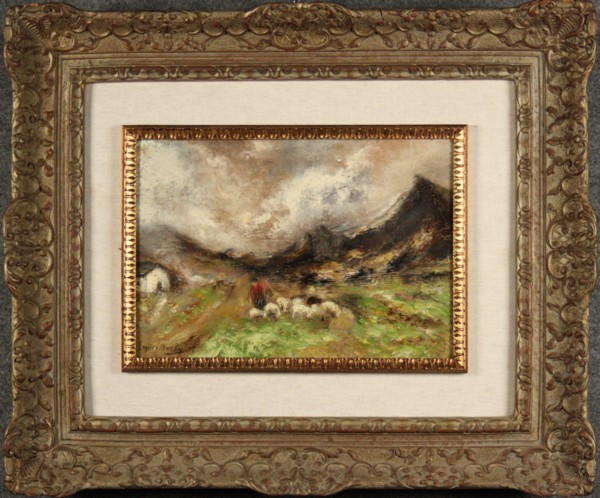 BORSA EMILIO - Nato a Milano nel 1857. Morto a Monza nel 1931. Nipote di Mosè Bianchi, allievo dell'Hayez all'Accademia di Brera. Ha partecipato alle principali rassegne di tutto il mondo. Fu premiato all'Esposizione di Parigi del 1889. Sue opere sono custodite nelle Gallerie d'Arte Moderna di Roma e di Milano. Dipinto olio su tavola raff. ''PASTORE CON GREGGE IN MONTAGNA''. Firmato in basso a destra. Mis. Lung. cm. 35 Alt. cm. 23,5 ca.