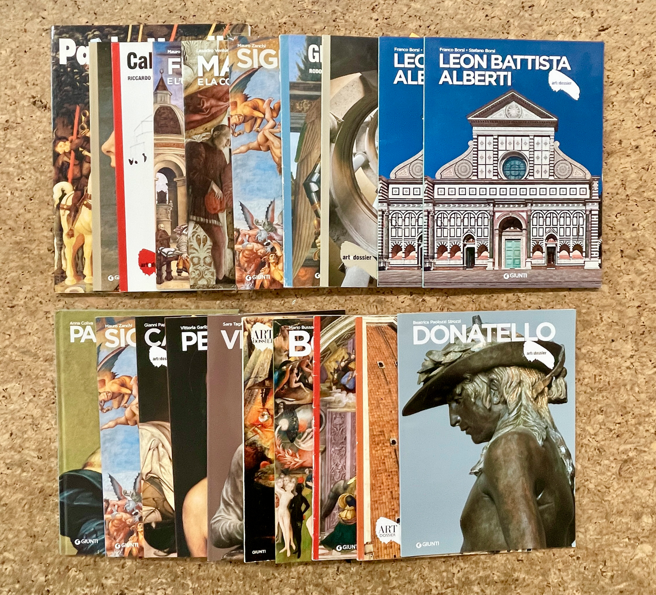 Lotto unico di 20 riviste Artedossier dedicate ai seguenti artisti e correnti: Paolo Uccello, Pintoricchio, Bosch, Futurismo, Verrocchio, Perugino, Parmigianino, Caravaggio, Signorelli (2), Mantegna, Filippino Lippi, I Pollaiolo, Brunelleschi, Donatello, Leon Battista Alberti (2), Bramante, Ghirlandaio, Calder