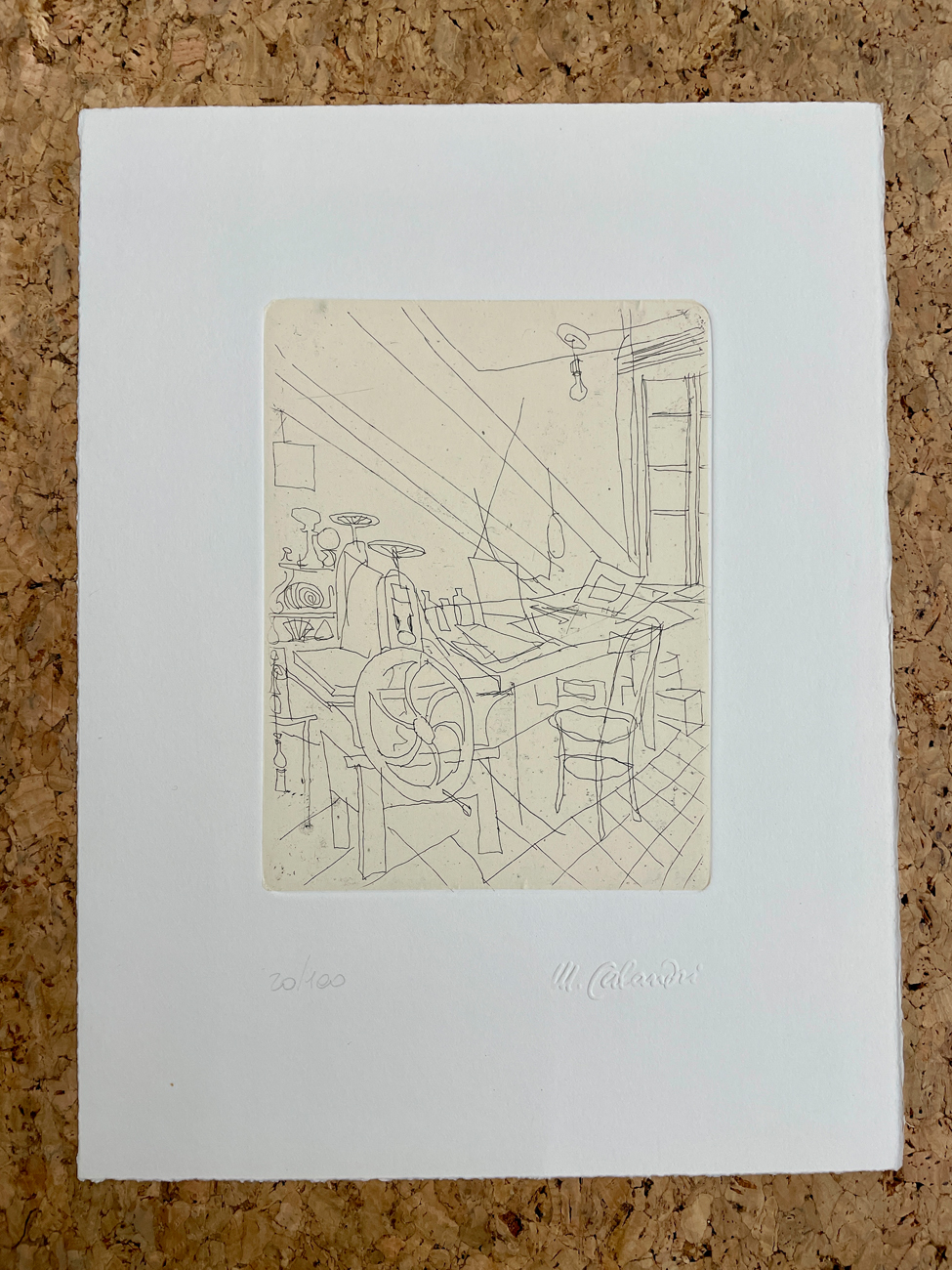 Il presente esemplare rientra nelle prime 200 copie ed è pertanto arricchito dalla presenza di un'incisione inedita sciolta di Mario Calandri (raffigurante lo Studio dell'Artista nel 1951), recante firma facsimile dell'Artista e numerazione (Esemplare 20) a matita al fronte L'edizione è stata curata in collaborazione con l'Archivio Calandri