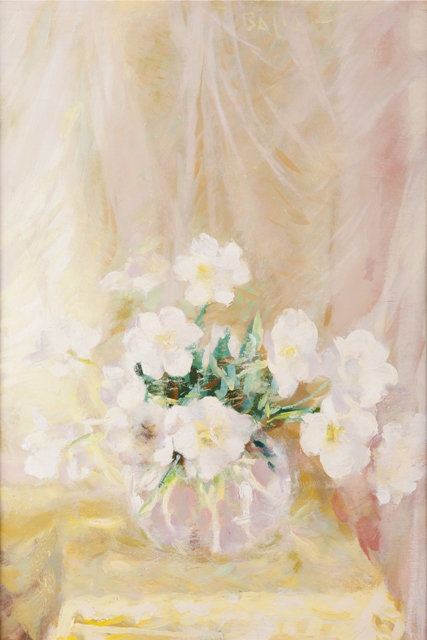 GIACOMO BALLA Torino 1871 - Roma 1958 In quella luce pallida e delicata, 1938 Olio su tavola, cm. 83 x 57 Firma in alto verso destra Firma, data e titolo al retro PROVENIENZA Casa Balla, Roma, fino alla successione ereditaria del 1993 Collezione privata romana Autentica su foto di Elena Gigli