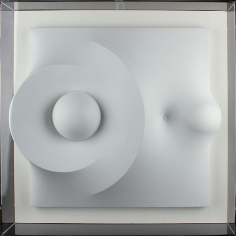 HECTOR RIGEL Italia 1957 Superficie bianca 27 Vernice acro vinilica su tela estroflessa cm. 52 x 45 In teca di plexiglass, cm. 56 x 56 Firma e data al retro Autentica su foto dell'Artista