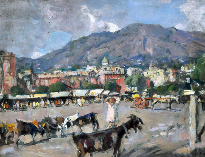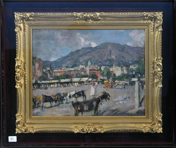 Villani Gennaro (Napoli 1885 - 1948) Mercatino olio su cartone, cm 30x40 firmato in basso a destra: G. Villani a tergo timbro Galleria Mediterranea, Napoli