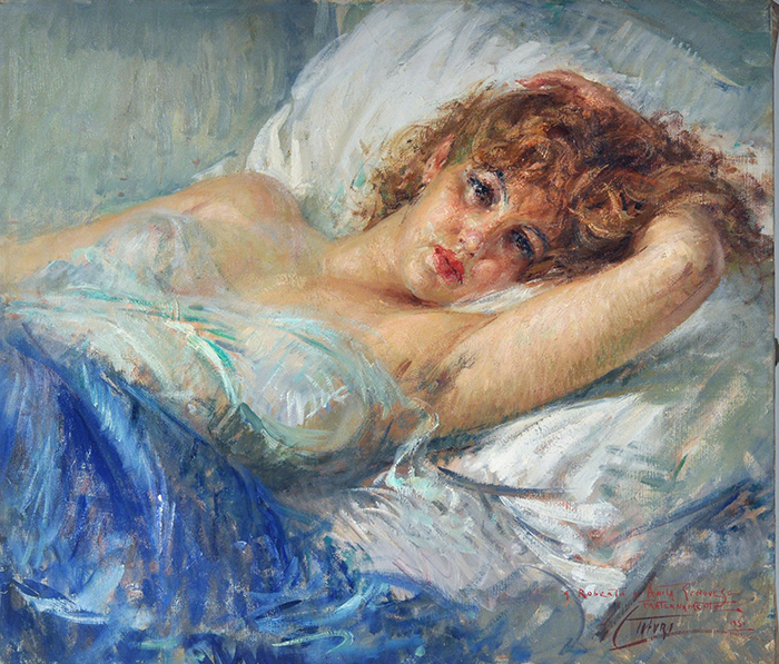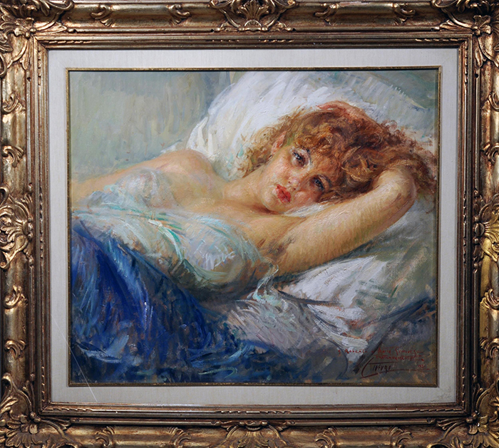 Tafuri Clemente (Salerno 1903 - Genova 1971) Figura distesa olio su tela, cm 60x70 dedicato firmato e datato in basso a destra: a Roberto e Anita Genovese fraternamente C. Tafuri 1951