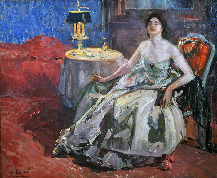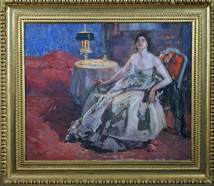 Caputo Ulisse (Salerno 1872 - Parigi 1948) Interno con figura femminile olio su tela, cm 60x73 firmato in basso a sinistra: U. Caputo