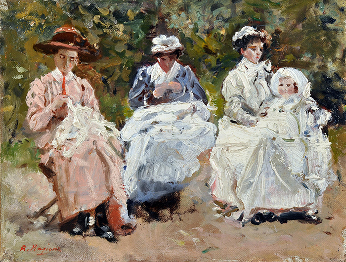 Ragione Raffaele (Napoli 1851 - 1925) Balie al Parc Monceau olio su tela, cm 22,5x29 firmato in basso a sinistra: R. Ragione