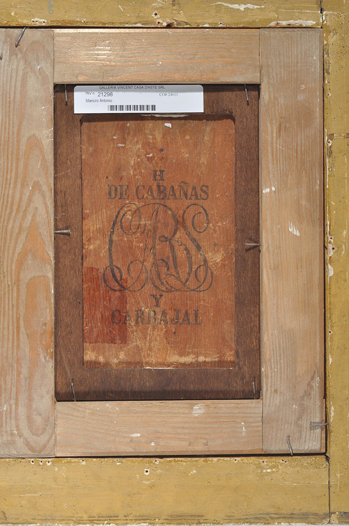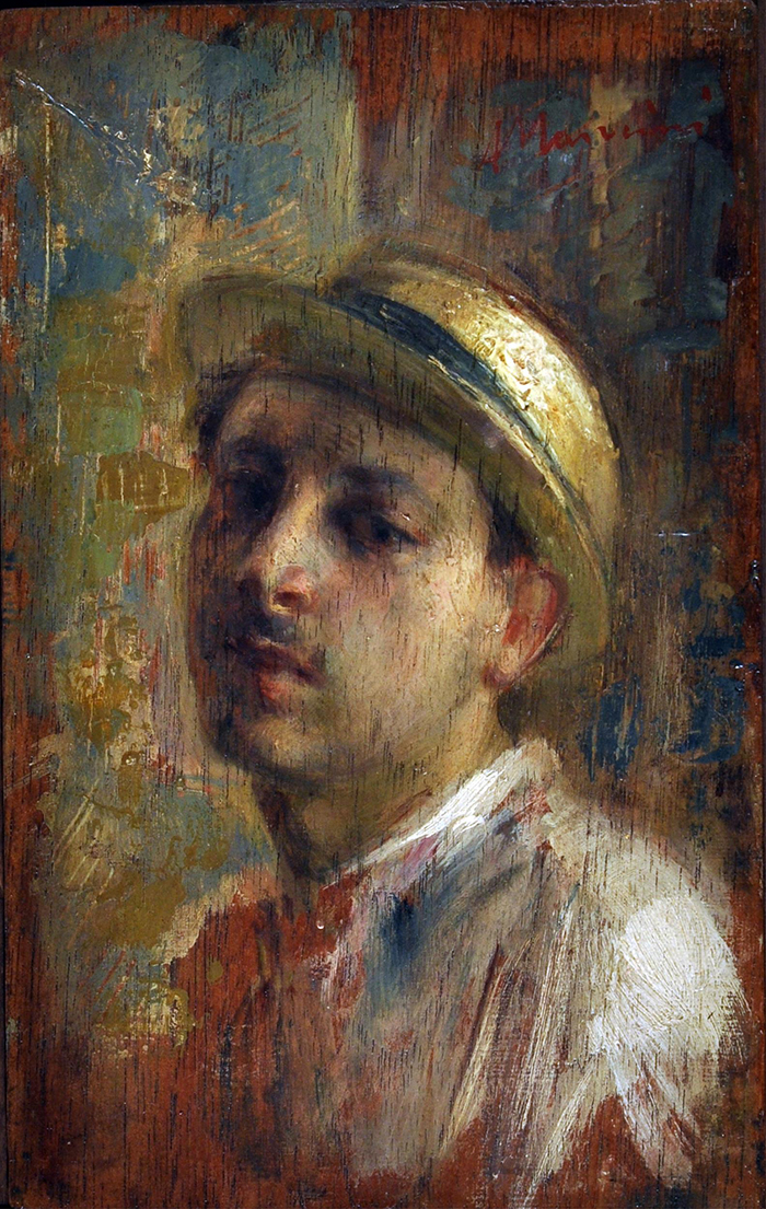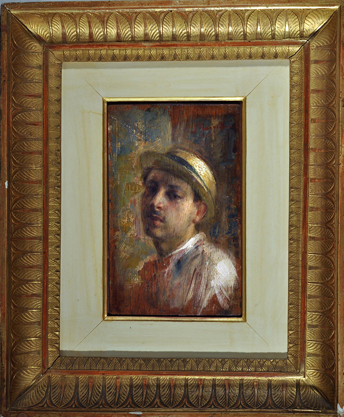 Mancini Antonio ( Roma 1852 - 1930 ) Uomo con cappello olio su tavola cm 23x14 firmato in alto a destra: A. Mancini Provenienza: Coll. privata, Bologna