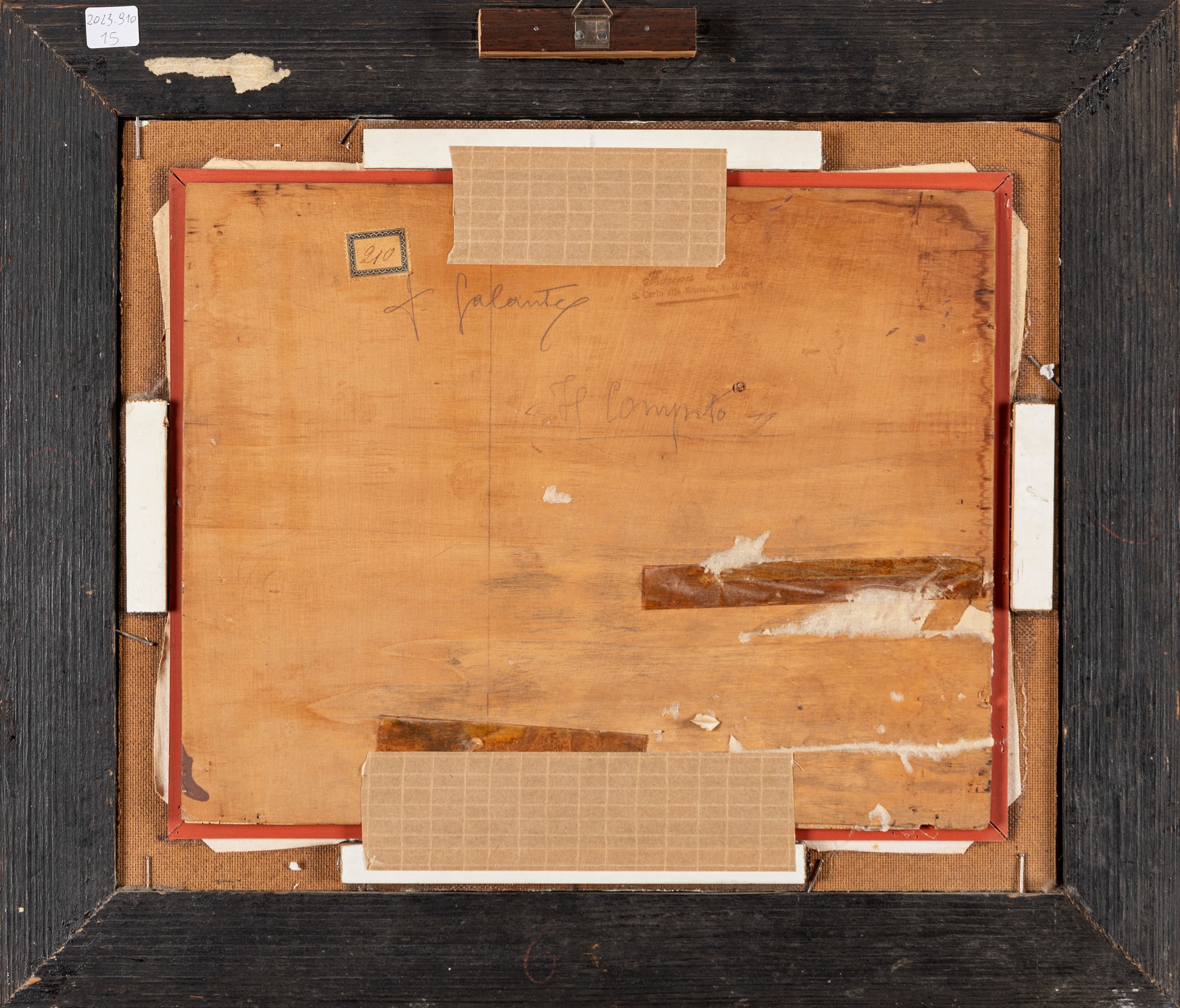 al retro, sul compensato, firmato e titolato; timbro del pittore e antica etichetta di inventario con numero 210