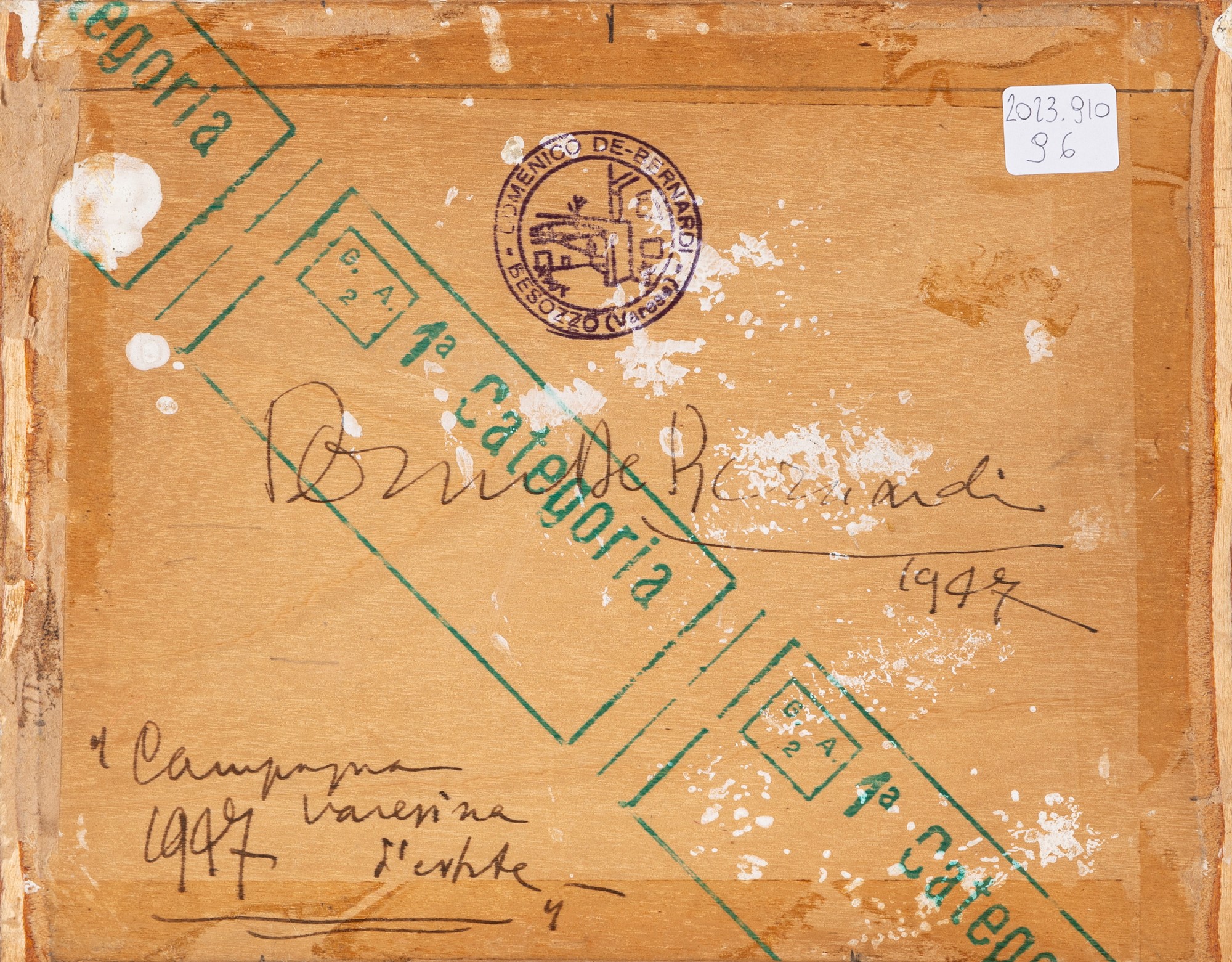 al retro, sul compensato, timbro del pittore, firma, data e titolo