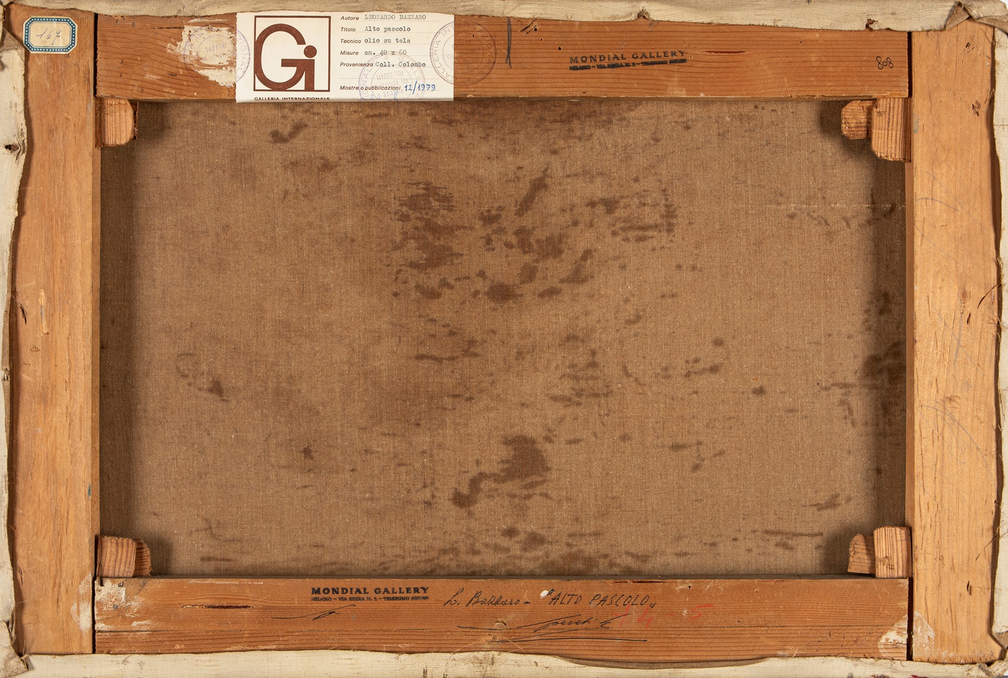 al retro, sul telaio, etichetta della Galleria Internazionale di Varese con provenienza (collezione Colombo), timbri della Mondial Gallery e vecchia etichetta di inventario con numero 167