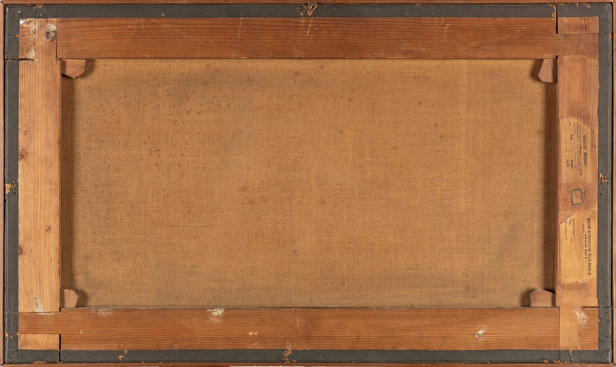 al retro, sul telaio, etichetta di provenienza della Galleria Milano con numero 843, etichetta di esposizione della Mostra retrospettiva delle opere di Emilio Gola alla Galleria Milano del dicembre 1929 e vecchia etichetta con numero di inventario 13