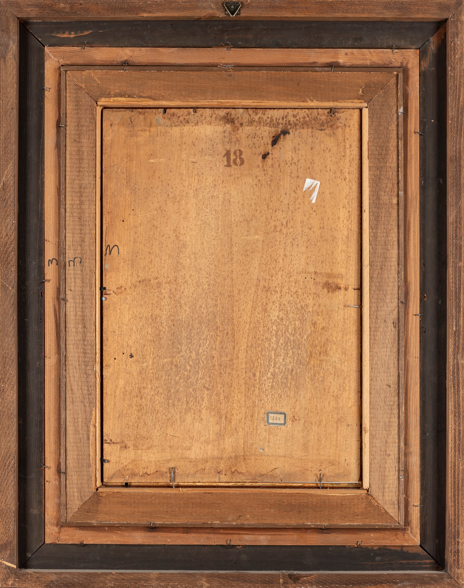 al retro, sulla tavola, etichetta con numero progressivo 468 e timbro con numero 18