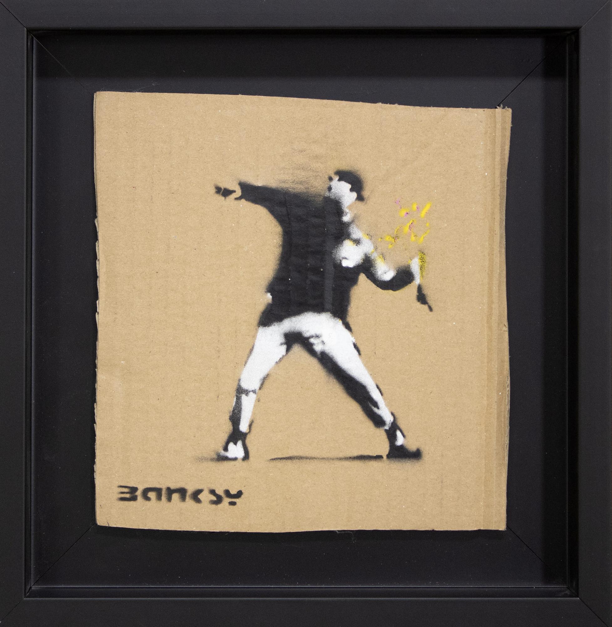Banksy (after), Enjoy your free art, 2015, graffiti e stencil su cartone - memorabilia, cm 27x19,5, esemplare 11/20, provenienza e timbro Dismaland riportati sul retro