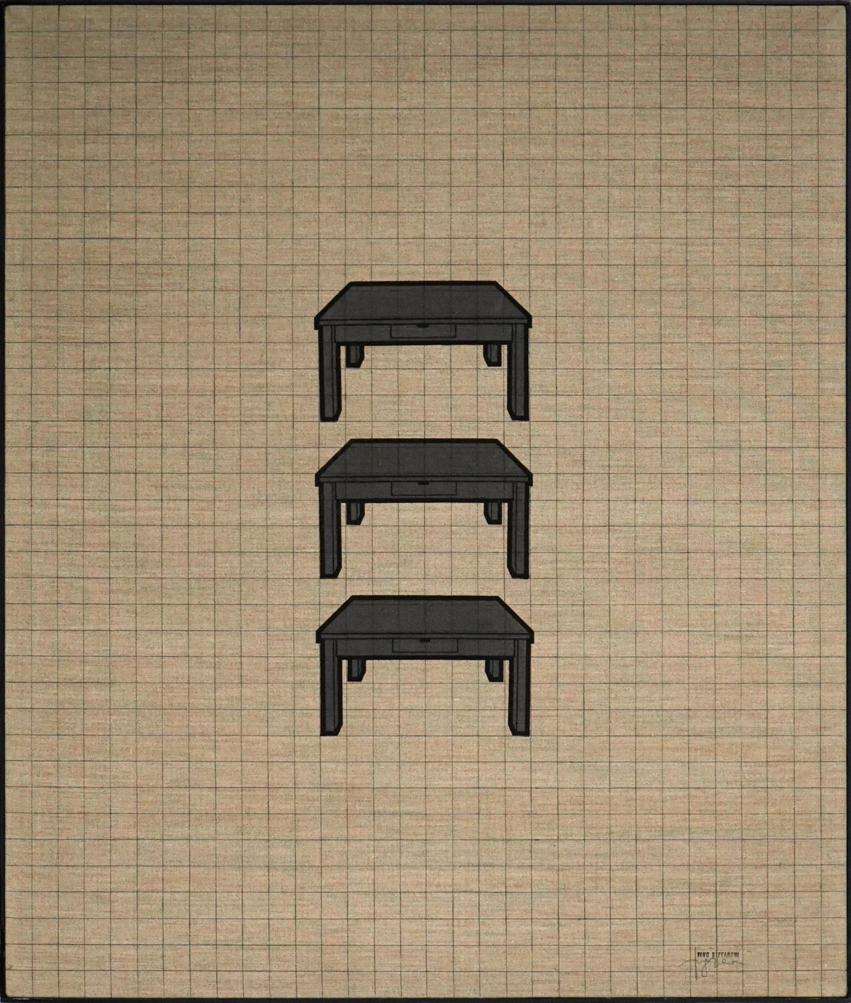 Tino Stefanoni, I tavoli grigi, 1975, olio su tela, cm 95x80, autentica a cura dell'artista