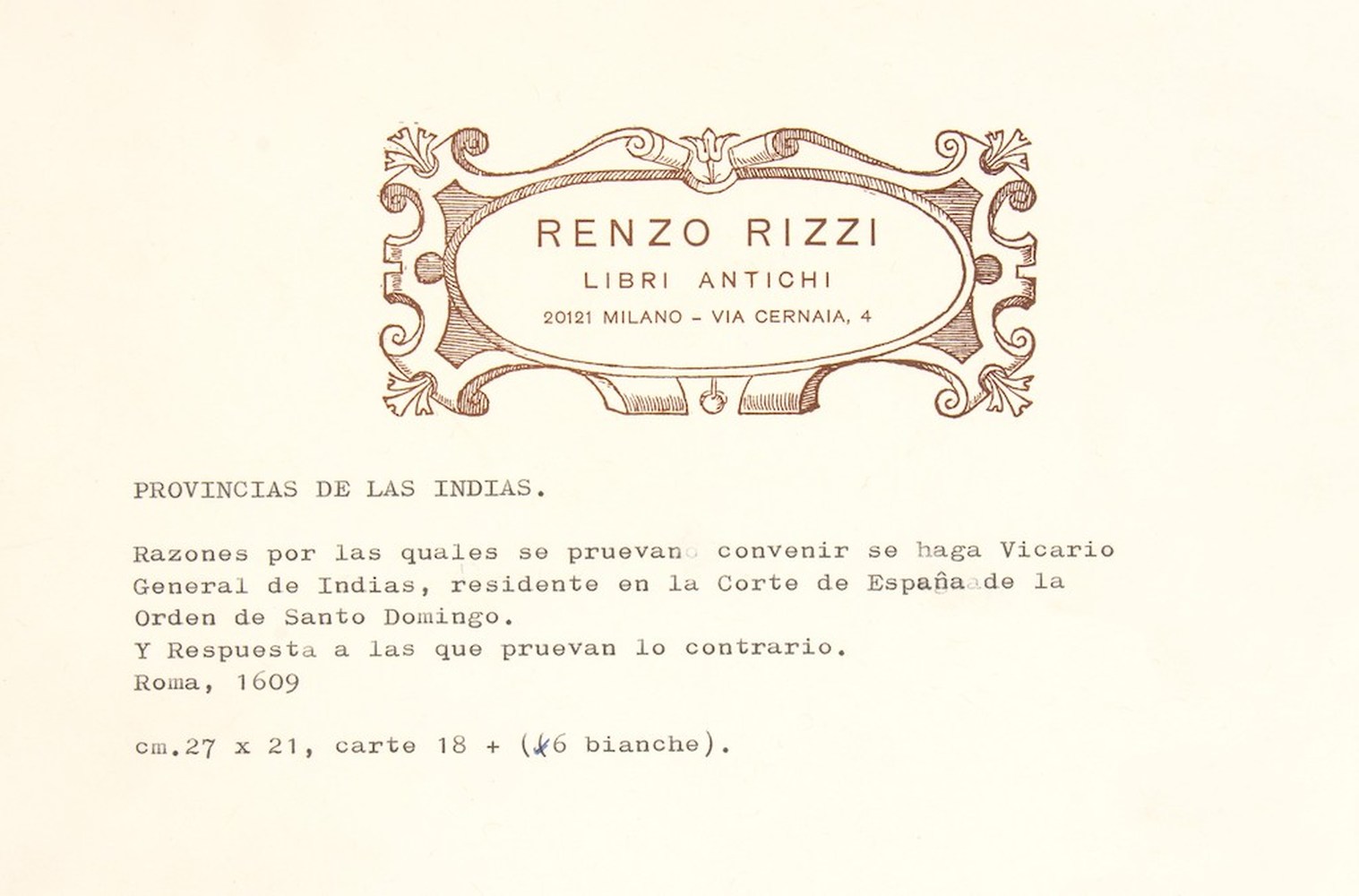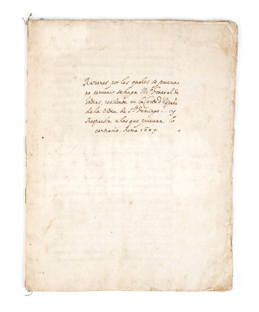 PROVINCIA DELLE INDIE RAZONES POR LAS QUALES SE PRUEVANO CONVENIR SE HAGA VICARIO GENERAL DE INDIAS RESIDENTE EN LA CORTE DE ESPANA DE LA ORDEN DE SANTO DOMINGO. Y RESPUESTA A LAS QUE PRUEVAN LO CONTRARIO. Roma 1609