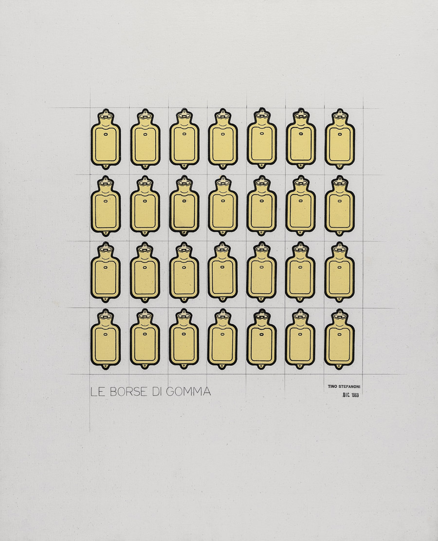 Tino Stefanoni , Lecco 1937 , "Le borse di gomma" 1969 tecnica mista su tela applicata su tavola, cm 100x80 Firmato, titolato e datato 12/1969 al retro L'opera è accompagnata da certificato di autenticità firmato dall'artista rilasciato dallo Studio Santandrea, Milano
