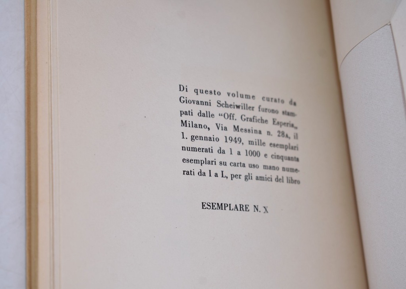 All'insegna del pesce d'oro, Milano. In-8º, mm. 180x130, pp. [68]. Brossura editoriale.