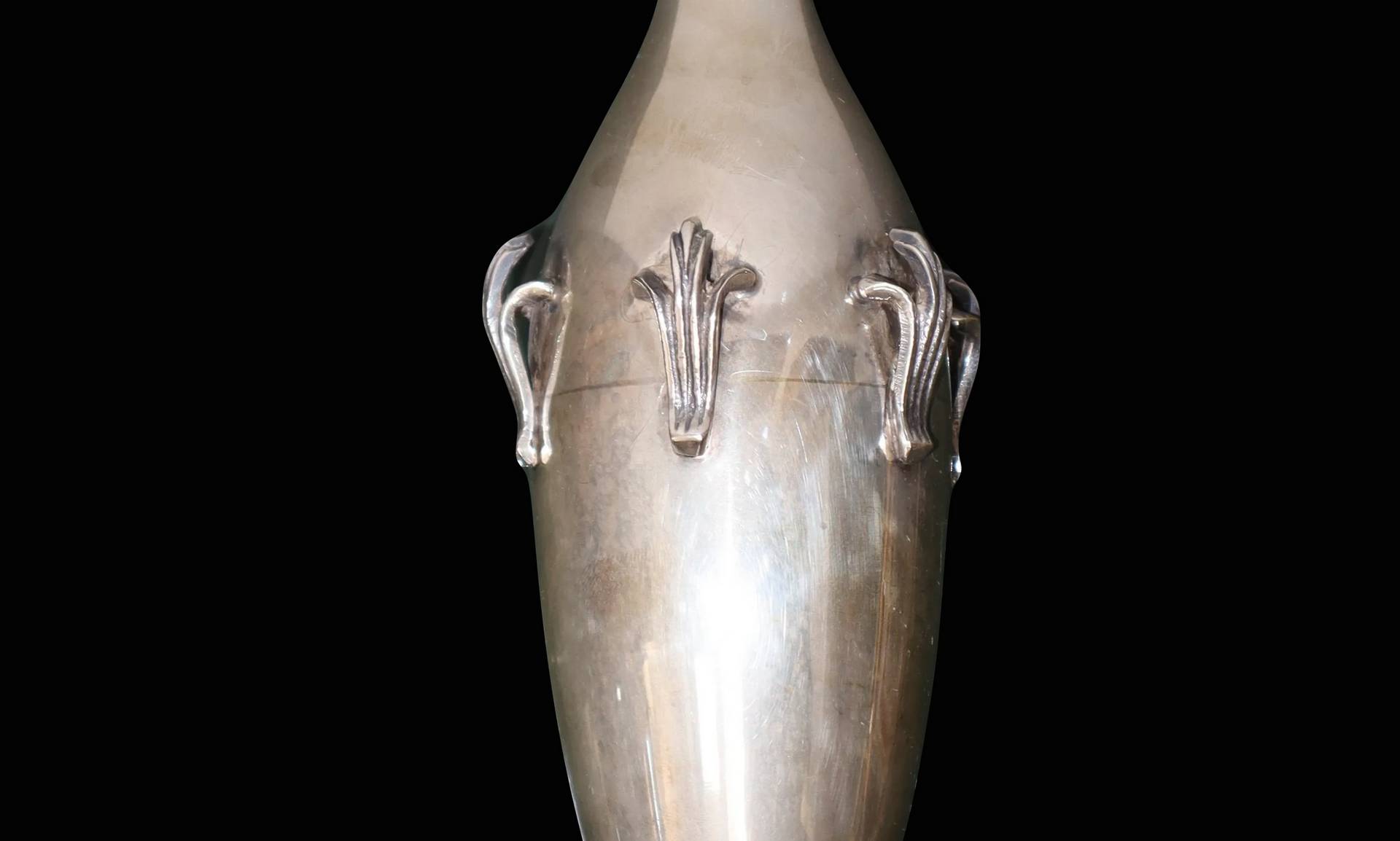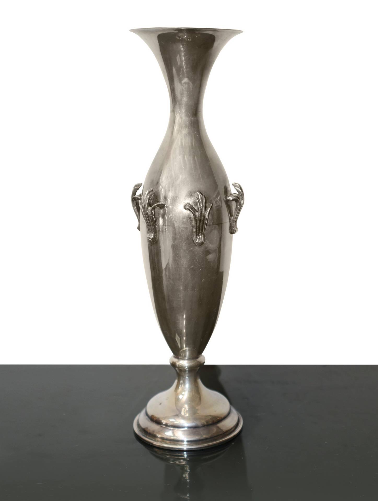 Vaso ad anfora in argento 800, con applicazioni a sbalzo.