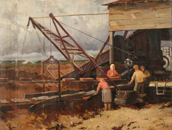 BARANOV ALEKSEJ PAVLOVIC - Nato nel 1923. Morto a Kostroma (Russia) nel 1999. Dipinto olio su tela raff. ''FABBRICA DI MATTONI CON OPERAI''. Firmato e datato 1989 in basso a destra. Mis. Lung. cm. 84 Alt. cm. 64 ca.