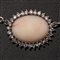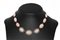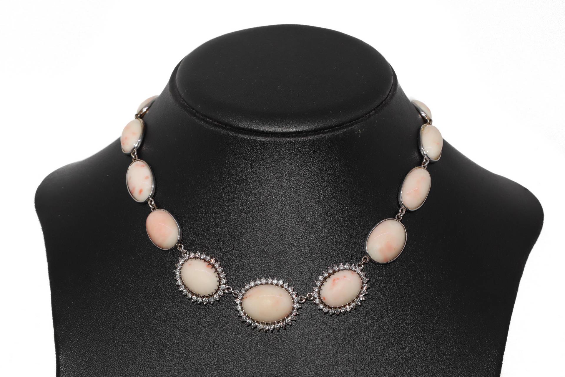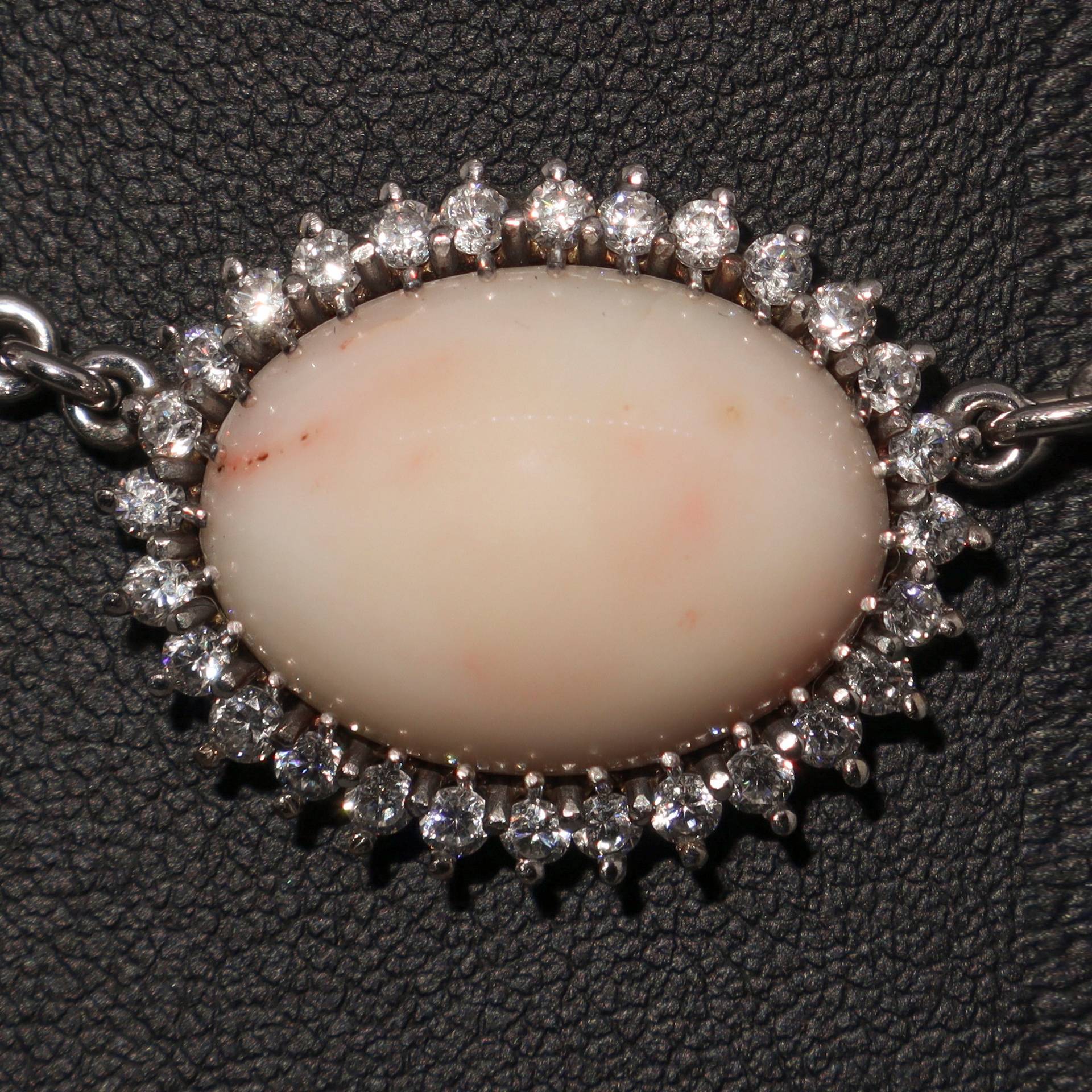 Collana in oro bianco con 13 ovali in corallo rosa Lunghezza complessiva 42 cm Con i tre centrali incastonati in una ghiera di piccoli brillanti.