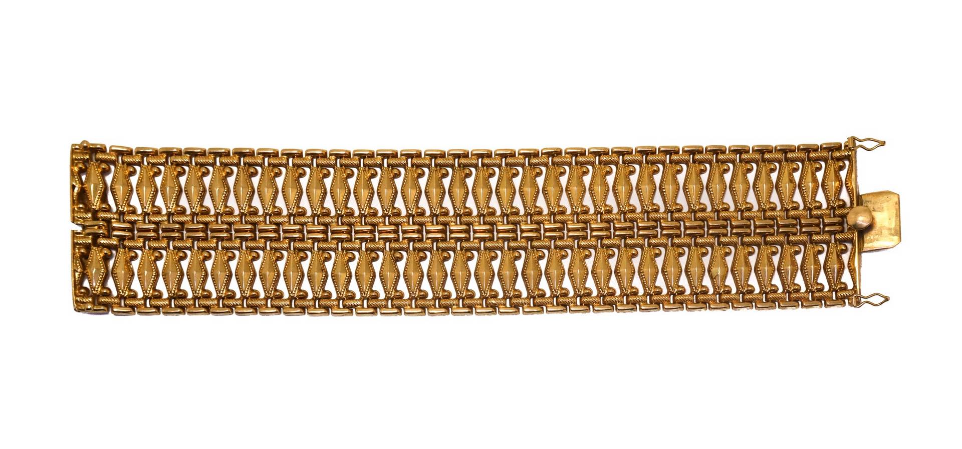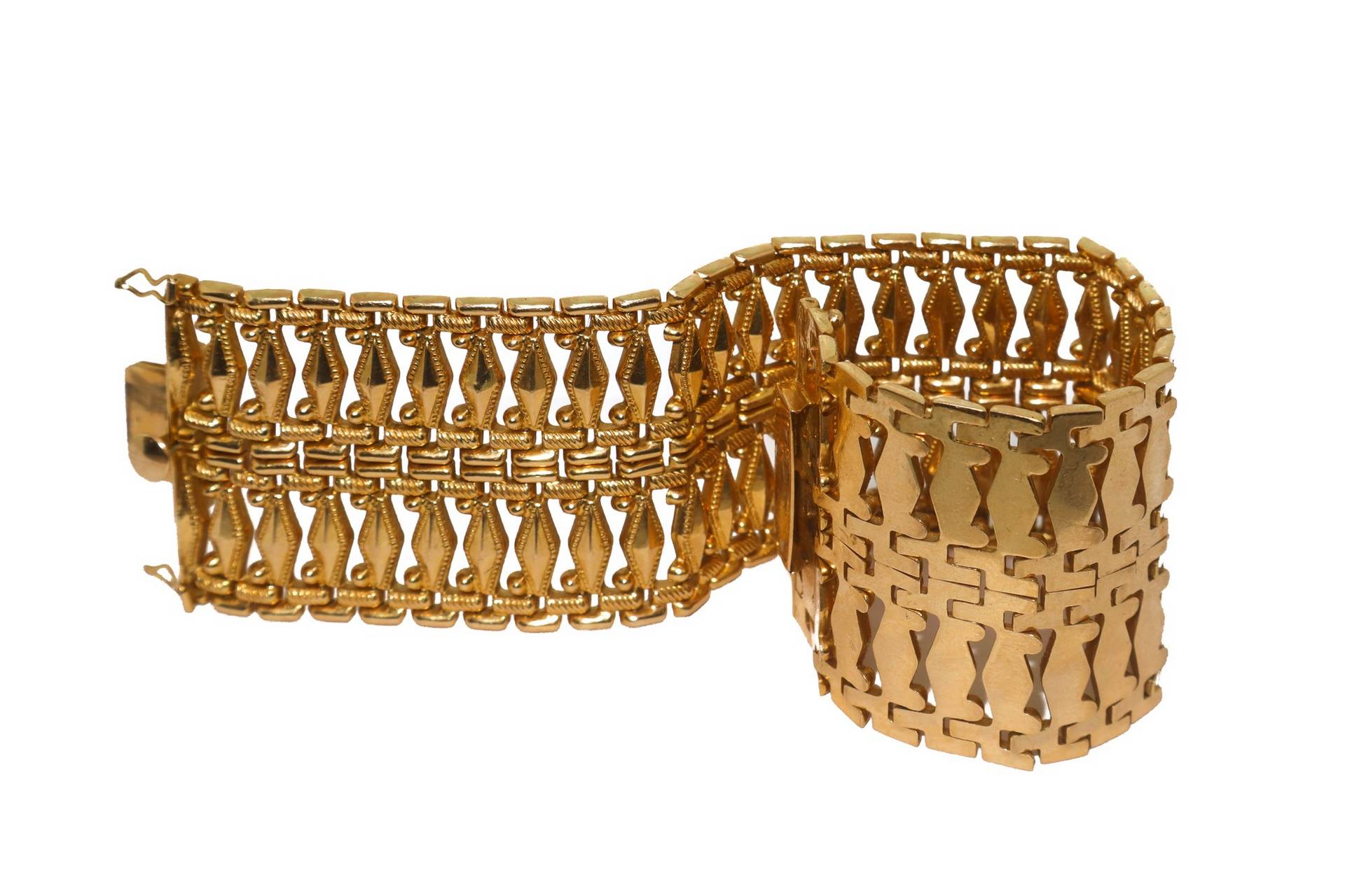 Importante bracciale a fascia grammi 66.5; larghezza cm 4,10 e lunghezza cm 19 Lavorazione a maglia e in oro rossoLavorazione a maglia e in oro rosso