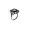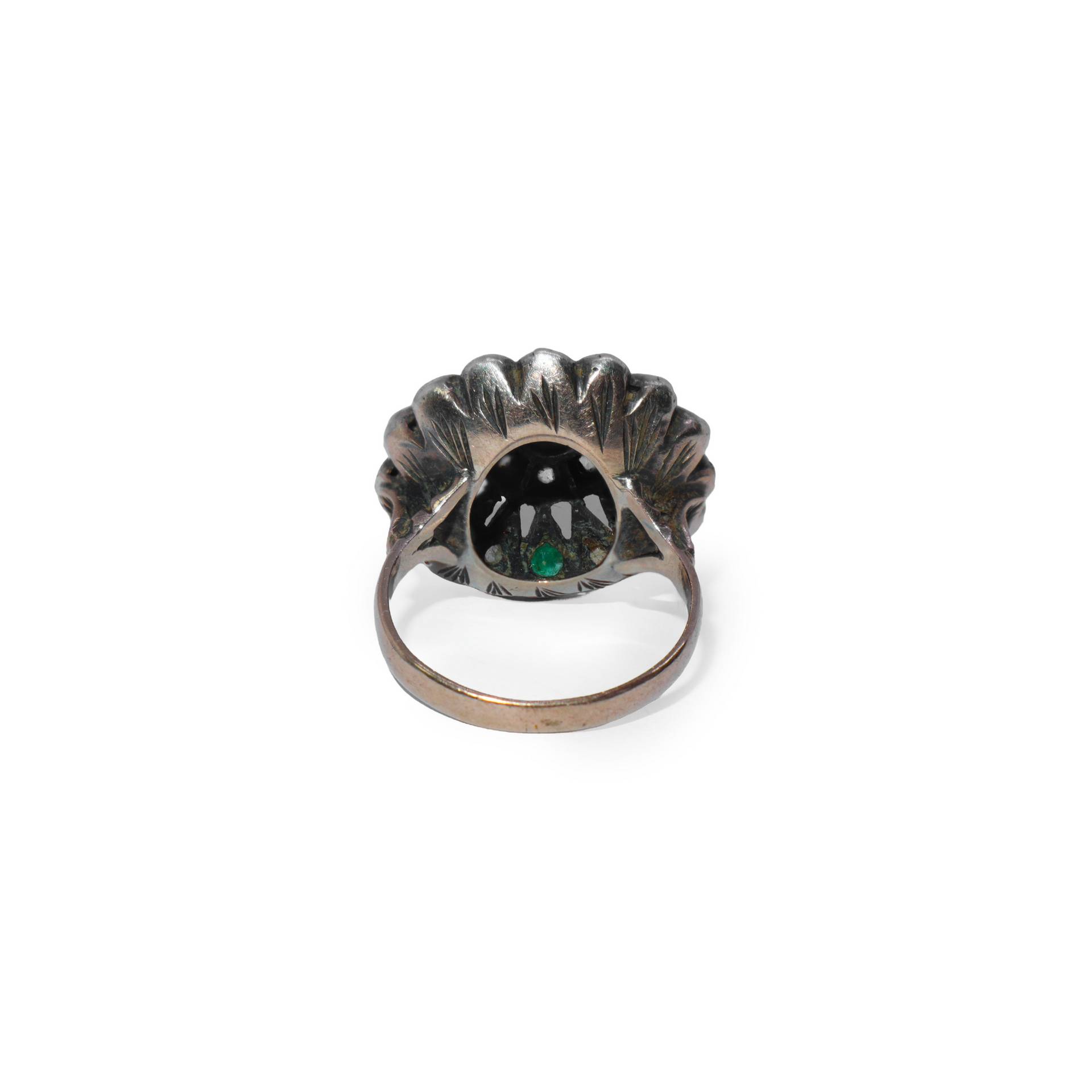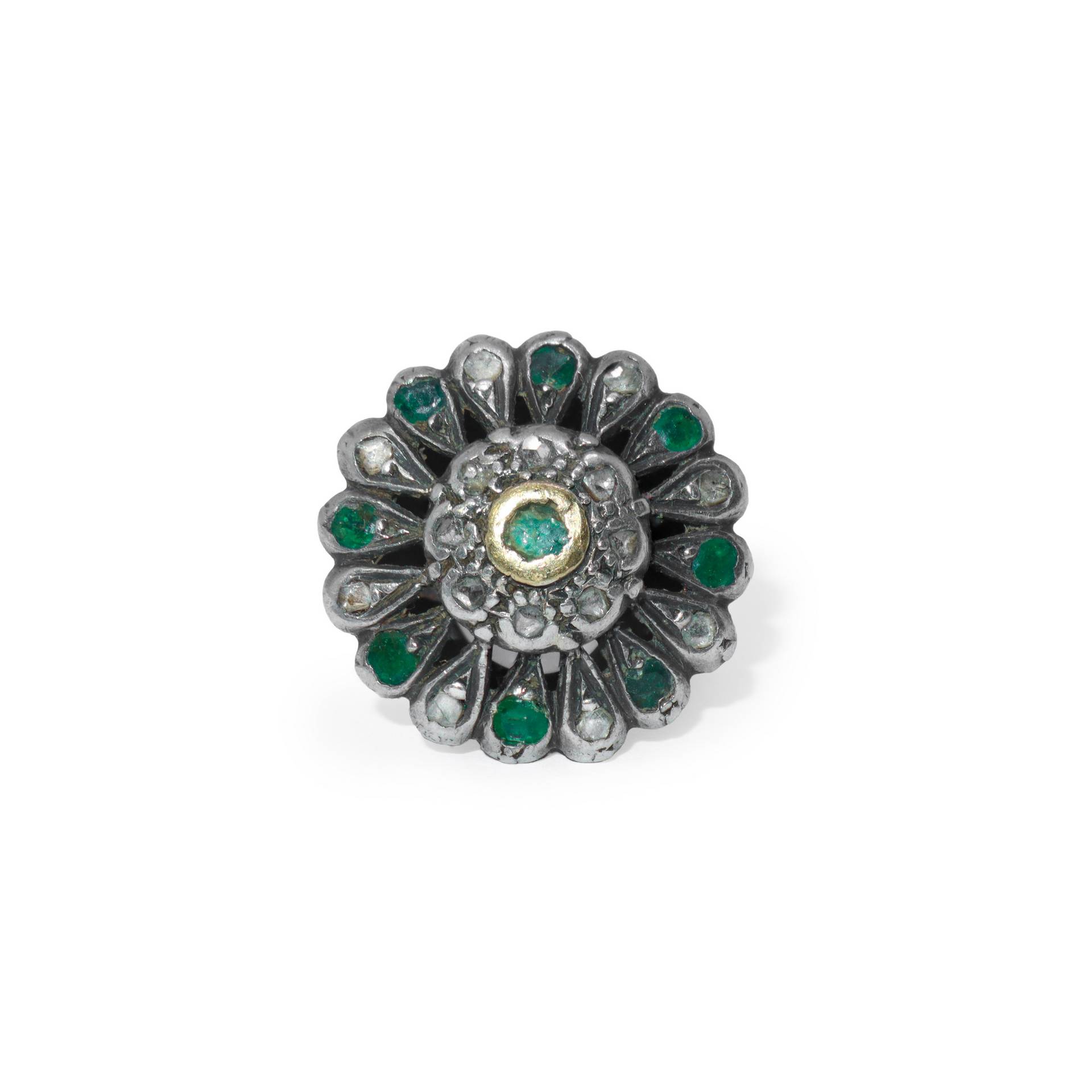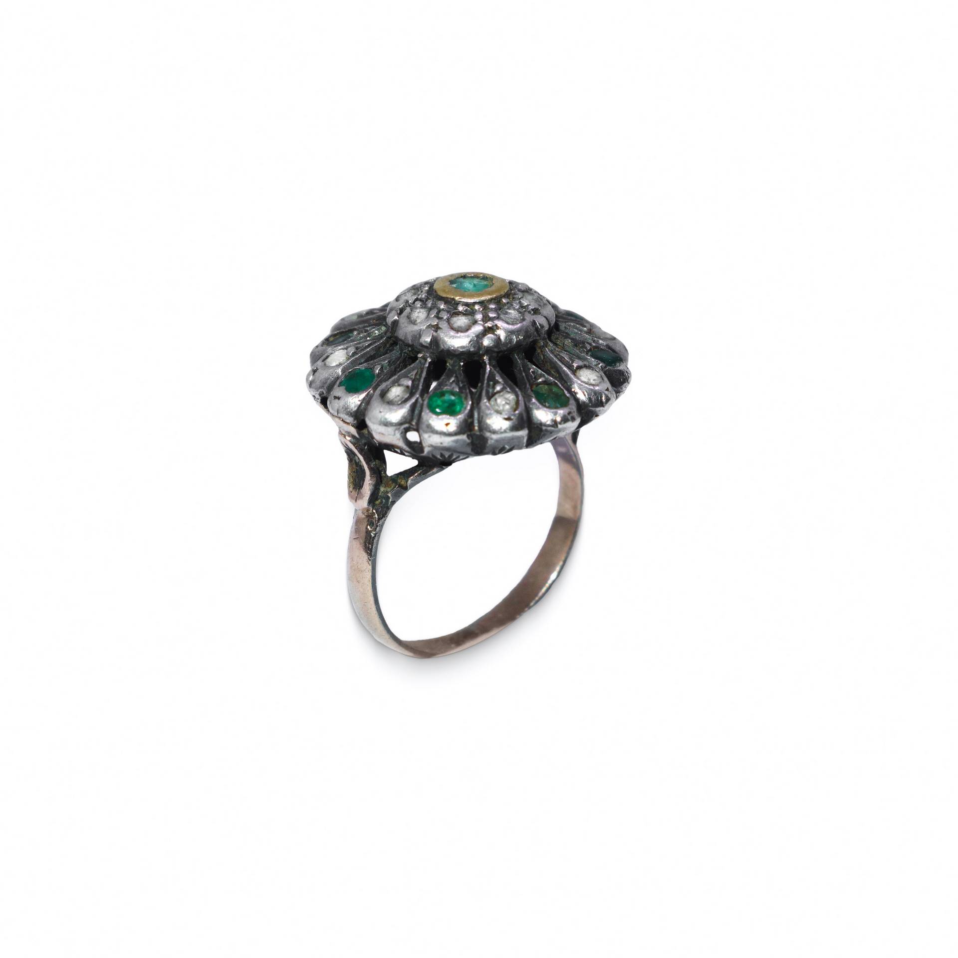 Anello a toppa con smeraldino centrale circondato da smeraldi e diamanti intervallati