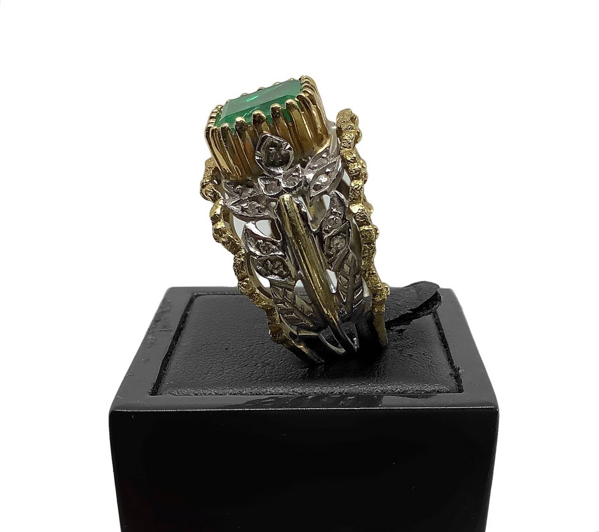 Anello in oro, 20° secolo 9,5 gr, misura 14 Lavorazione in oro con smeraldo centrale e scagliette su piccole foglie in oro bianco nelle parti laterali (nello stile Buccellati).Lavorazione in oro con smeraldo centrale e scagliette su piccole foglie in oro bianco nelle parti laterali (nello stile Buccellati).