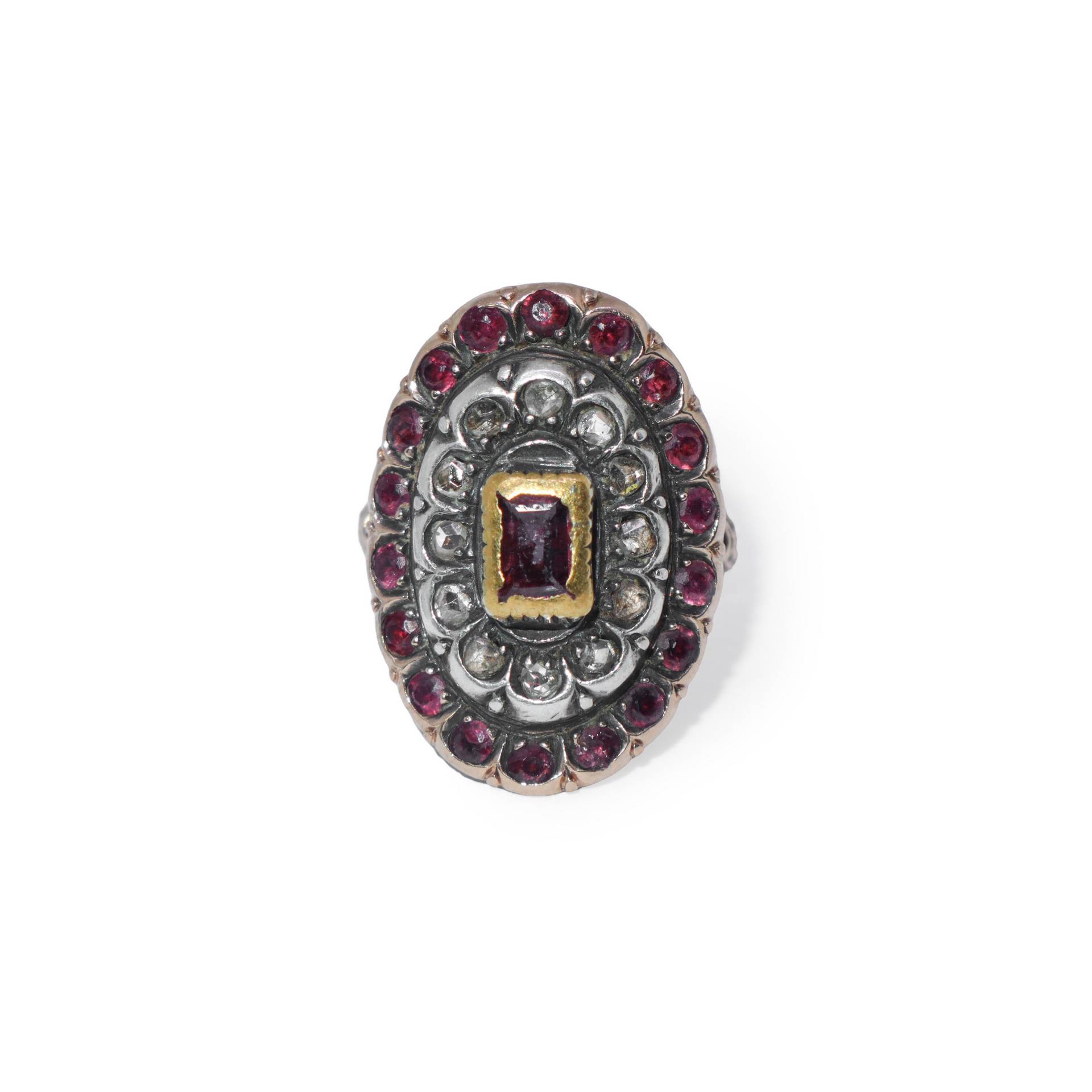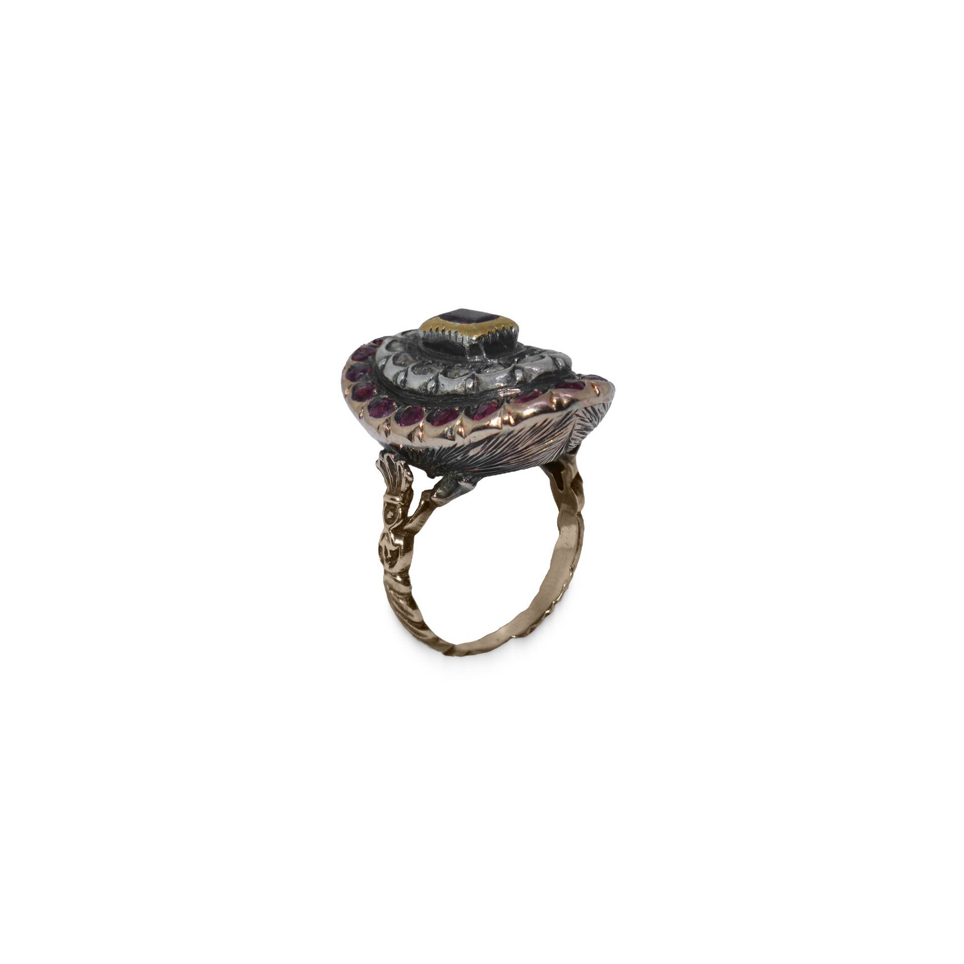 Anello in oro a toppa ovale con gambo cesellato, rubino centrale contornato da rose e rubini, 1930s 7,5 gr - cm 2.3x1.6