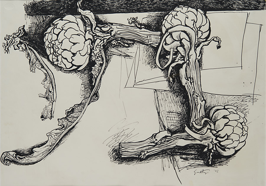Renato Guttuso , Bagheria 1912 , Roma 1987 "Natura morta con carciofi" 1972 tecnica mista su carta, cm 49x68 Firmato e datato 72 in basso a destra Provenienza Galleria d'Arte la Tavolozza, Civitanova Marche L'opera è accompagnata da certificato su fotografia rilasciato dall'Archivio Renato Guttuso, Roma