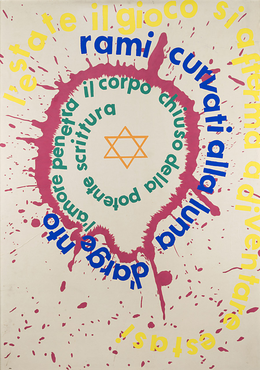 Ugo Carrega , Genova 1935 , "Dolce miracolo" (dalla serie "Il pensiero fatto cosa, algoritmi lirici" 1984 tecnica mista su carta applicata su tavola, cm 140x100 Firmato, titolato e datato 1984 al retro Provenienza Mercato del Sale, Milano Collezione privata, Milano Esposizioni "Immagini di scrittura" Circolo Culturale koh-I-Noor, Milano, 1985 Bibliografia Ugo Carrega "Commentario" Ed.Morra, Napoli, 1985 L'opera è accompagnata da certificato di autenticità su fotografia rilasciato dall'artista