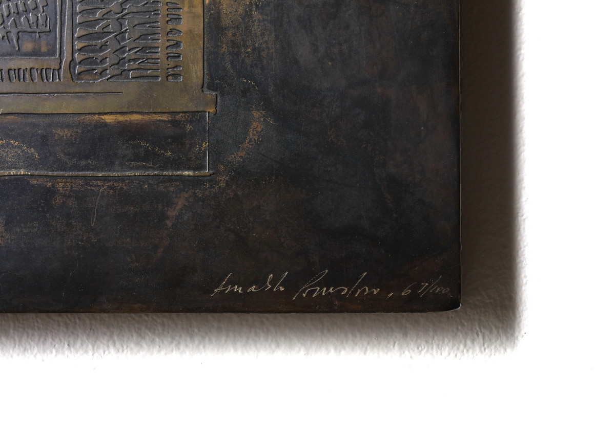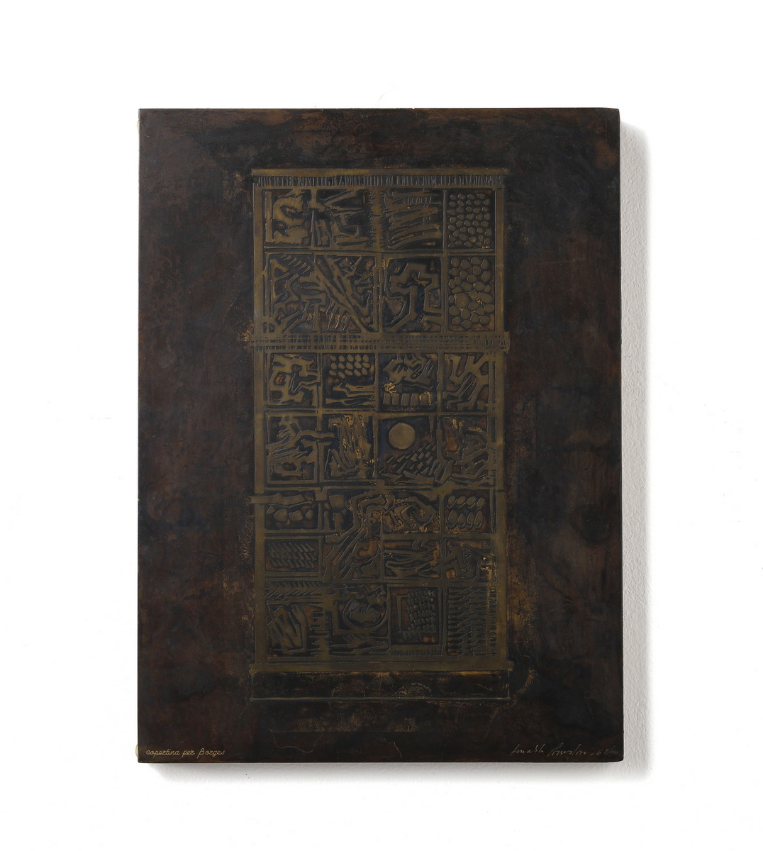 POMODORO ARNALDO (n. 1926) COPERTINA DEL LIBRO DI POESIA SEVEN SAXON POEMS DI J.L.BORGES, 1974. Bassorilievo in bronzo su tavola. Cm 29,00 x 39,00 x 2,00. firma e tiratura incise, es. 67/100.
