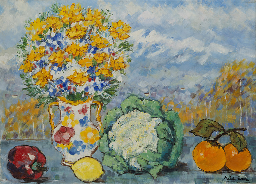 Michele Cascella , Ortona 1892 , Milano 1989 "Natura morta" 1973 olio su tela, cm 50x70 Firmato in basso a destra L'opera è accompagnata da certificato di autenticità su fotografia rilasciato dall'artista Parere verbale di autenticità rilasciato dall'Archivio Cascella a cura della Galleria Torcular, Milano
