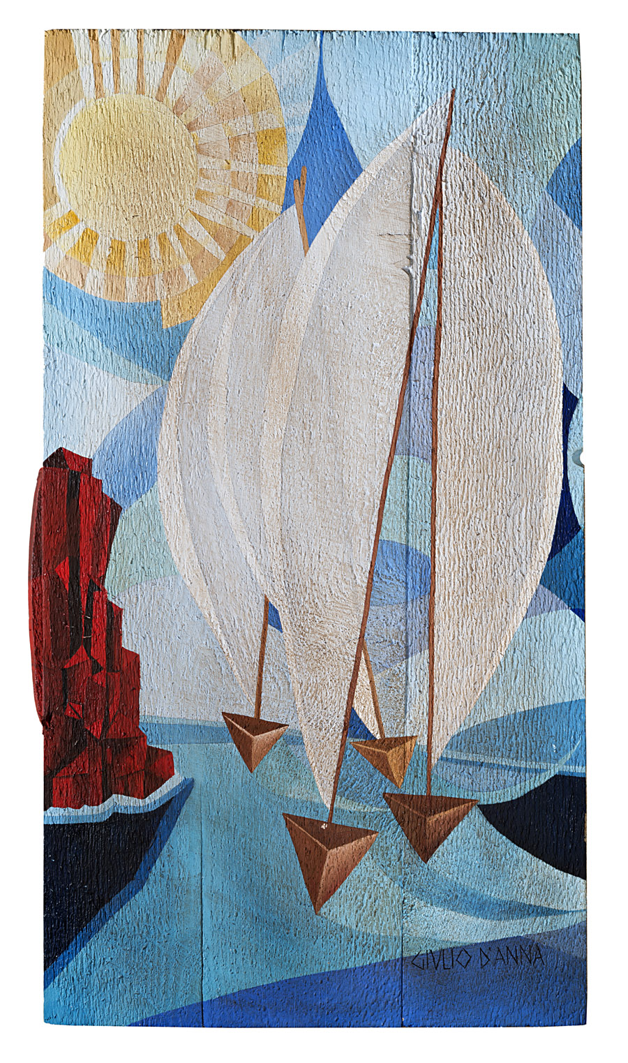 Giulio D'Anna , Villarosa 1908 , Messina 1978 "Vele sullo stretto (diurno)" 1929-30 circa tempera e tecnica mista su tavola, cm 73x40 Firmato in basso a destra Opera archiviata presso gli Archivi del Futurismo in Sicilia, Palermo con il n.AFS202 in data 20/08/2013