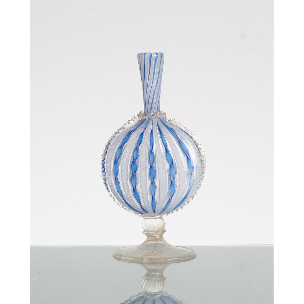Bottiglia in vetro zanfirico, vetro trasparente nei toni del blu e oro.
