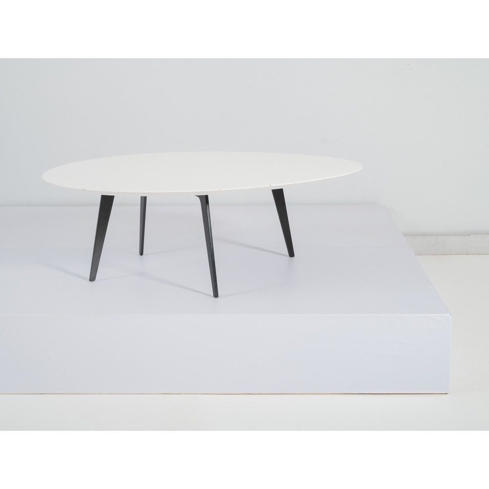 Tavolo basso con struttura in metallo verniciato nero, piano ovalizzato in legno laccato bianco, difetti e mancanze sul piano.