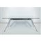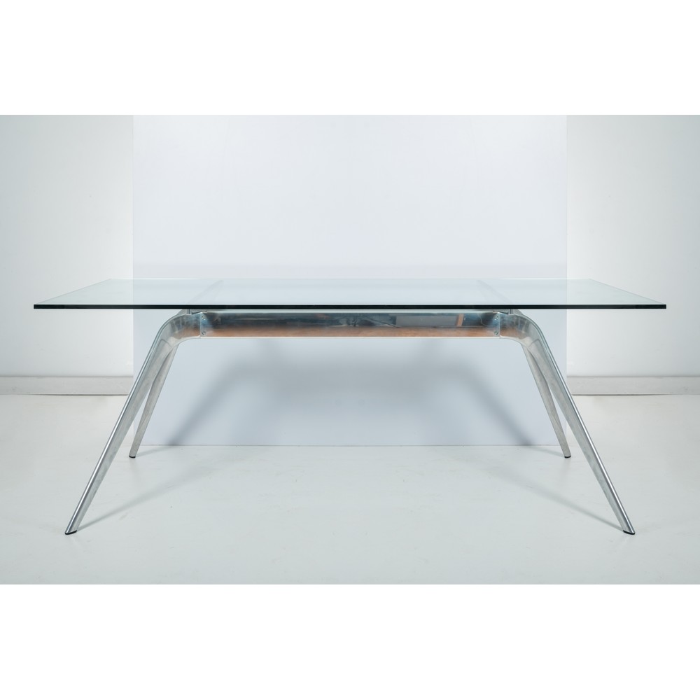 Tavolo da pranzo modello “T-No 1”, piano rettangolare in cristallo di grosso spessore, piede in alluminio lucidato a specchio. Etichetta di produzione.