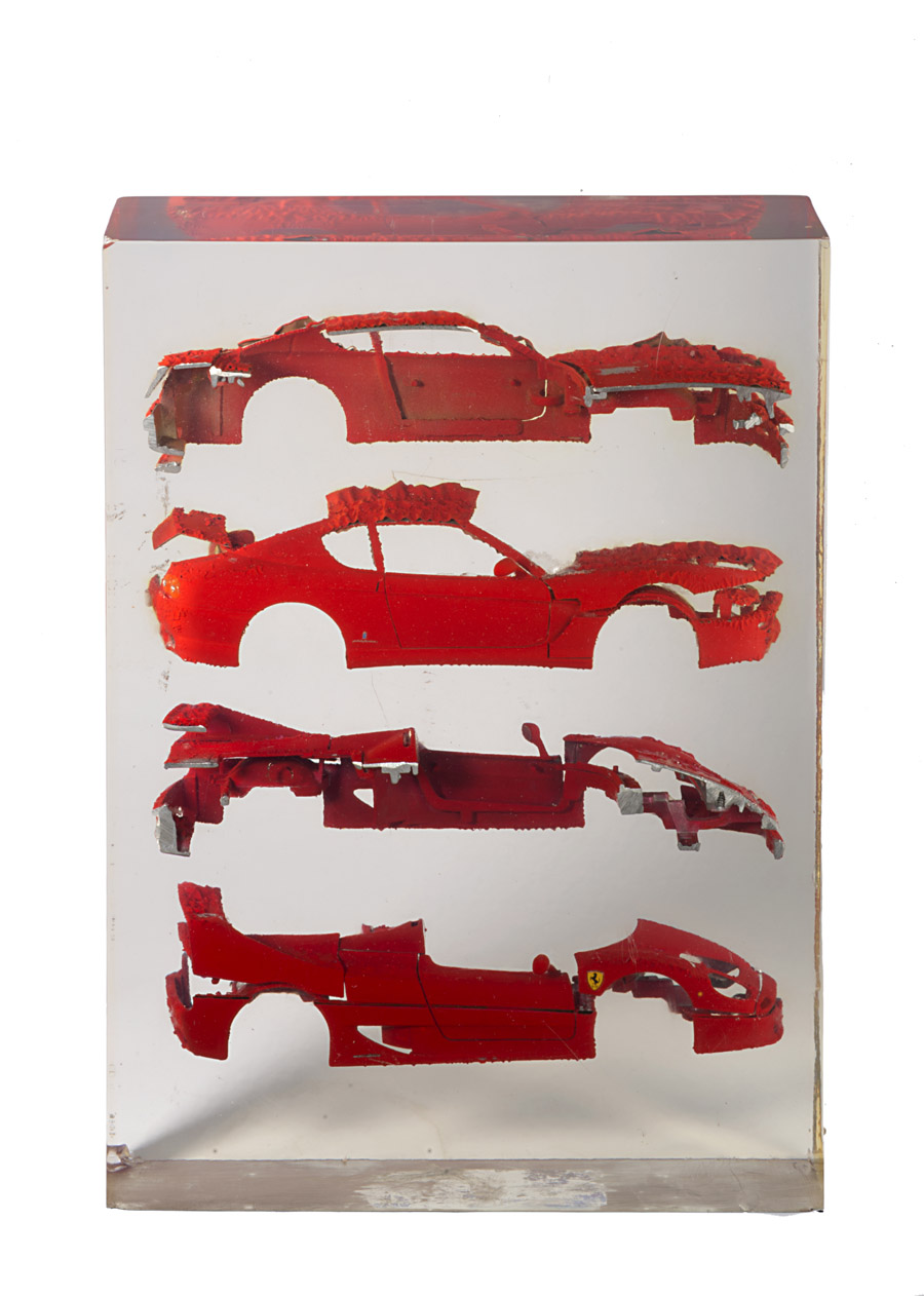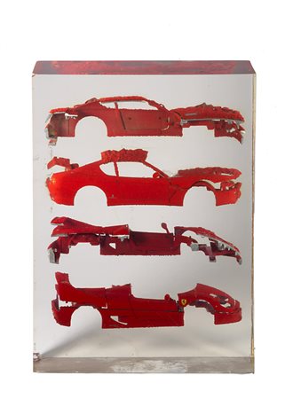 Arman , Nizza 1928 , New York 2005 "Ferrari" 1995 metallo, resina e plexiglass, cm 39,7x28x6,9 (pezzo unico) Firmato in basso a destra Provenienza Galleria d'Arte Maggiore, Bologna Collezione privata, Torino L'opera è archiviata presso gli Archives Denyse Durand-Ruel, Parigi con il n.6235