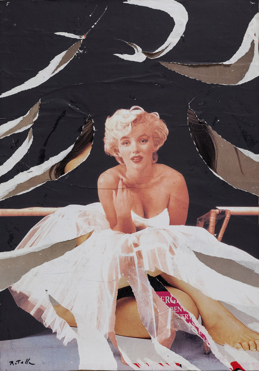 Mimmo Rotella , Catanzaro 1918 , Milano 2006 "Marilyn at festival" 2003 decollage su tela, cm 99x69,5 Firmato in basso a sinistra. Titolato e datato 2003 al retro L'opera è accompagnata da certificato di autenticità su fotografia rilasciato dall'artista L'opera è accompagnata da certificato di autenticità su fotografia rilasciato dalla Fondazione Mimmo Rotella con il n.20699/03
