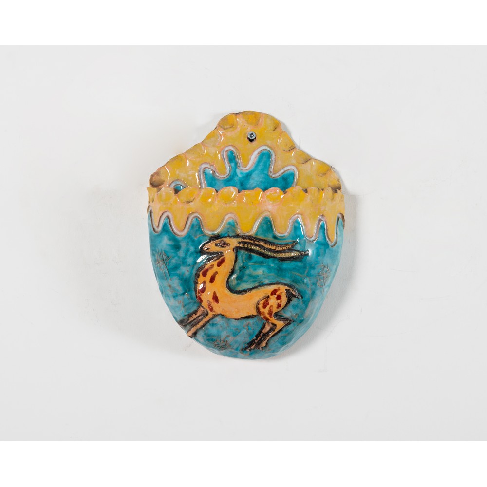 Porta corrispondenza in ceramica smaltata e decorata con figura di antilope su fondo verde, decoro giallo superiore, corpo semi ovale.