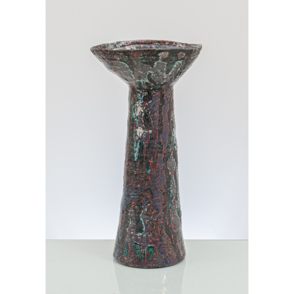 Vaso in ceramica smaltata invetriata e decorata in policromia e con smalti ossidati, corpo conico con collo semisferico. bocca informale piana. Firma e data. Restauri.