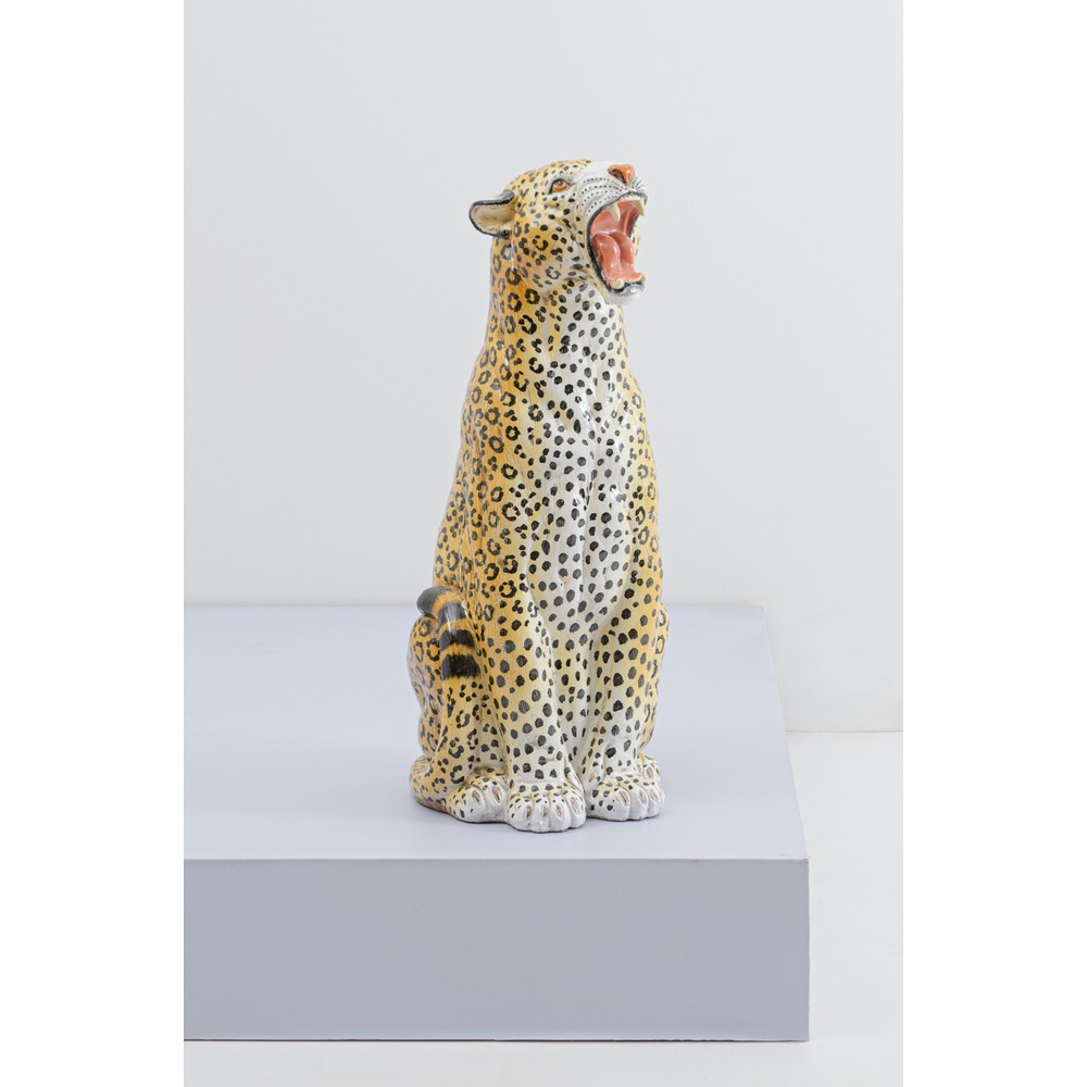 Scultura di leopardo in terracotta smaltata e decorata in policromia.