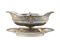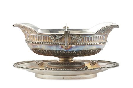 Salsiera in argento con anse squadrate sorrette da quadrifoglio e corpo decorato da fiori a motivo concatenato, cifrata FC con vasca bipartita. Odiot, Parigi, fine secolo XIX (g 1400) (cm 27x10x16) (difetti)